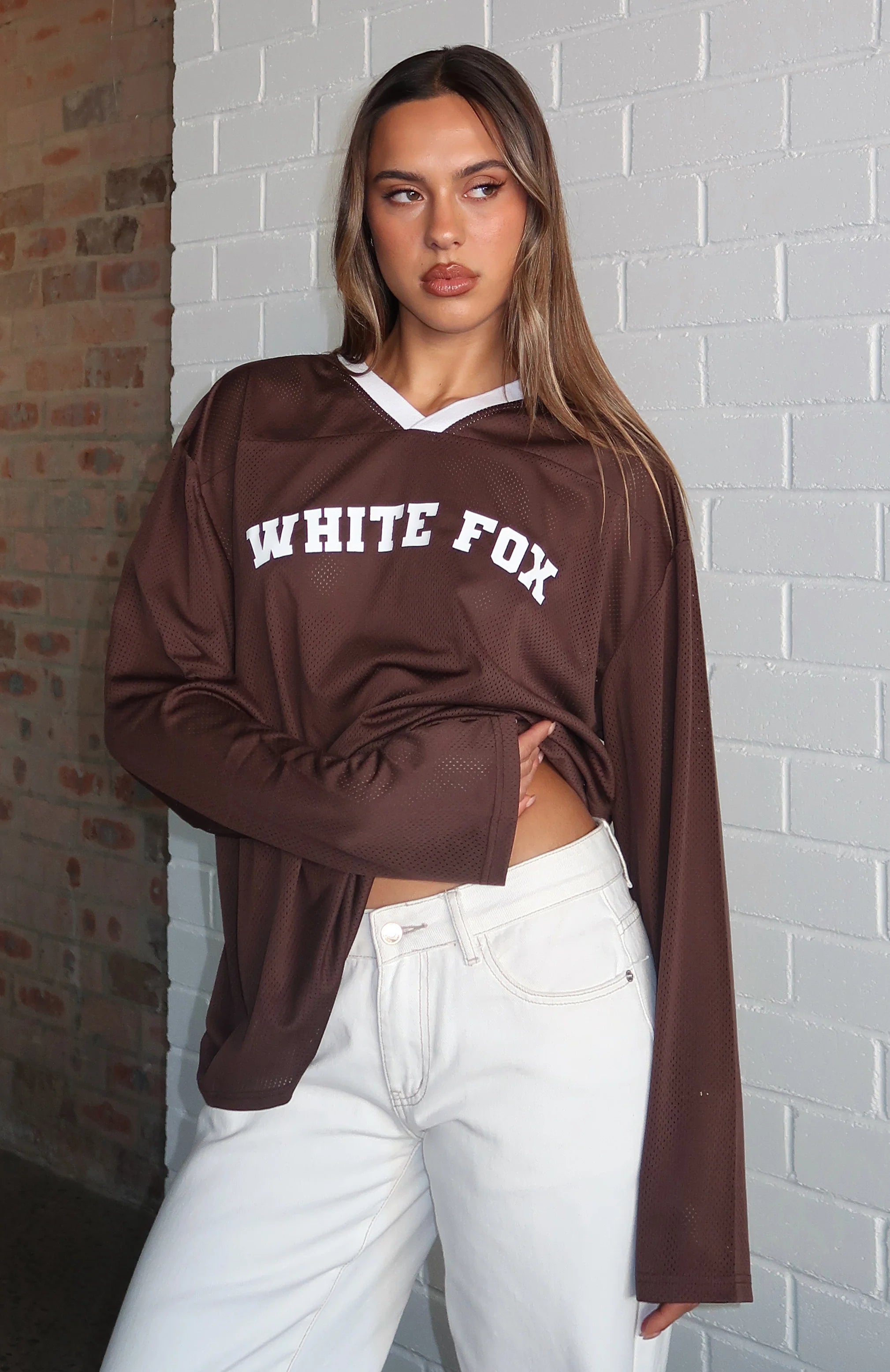 Bring a cool edge to your wardrobe with the Ahead Of Schedule Long Sleeve Oversized Jersey in Chocolate! Features a V‑neckline, slouched shoulders, long sleeves, an oversized silhouette, a centre‑front printed White Fox text, ribbed neckline detailing, and unlined stretch fabric for easy comfort. Style with your go to denim jeans, sunnies and sneakers for a casual but cool weekend fit.