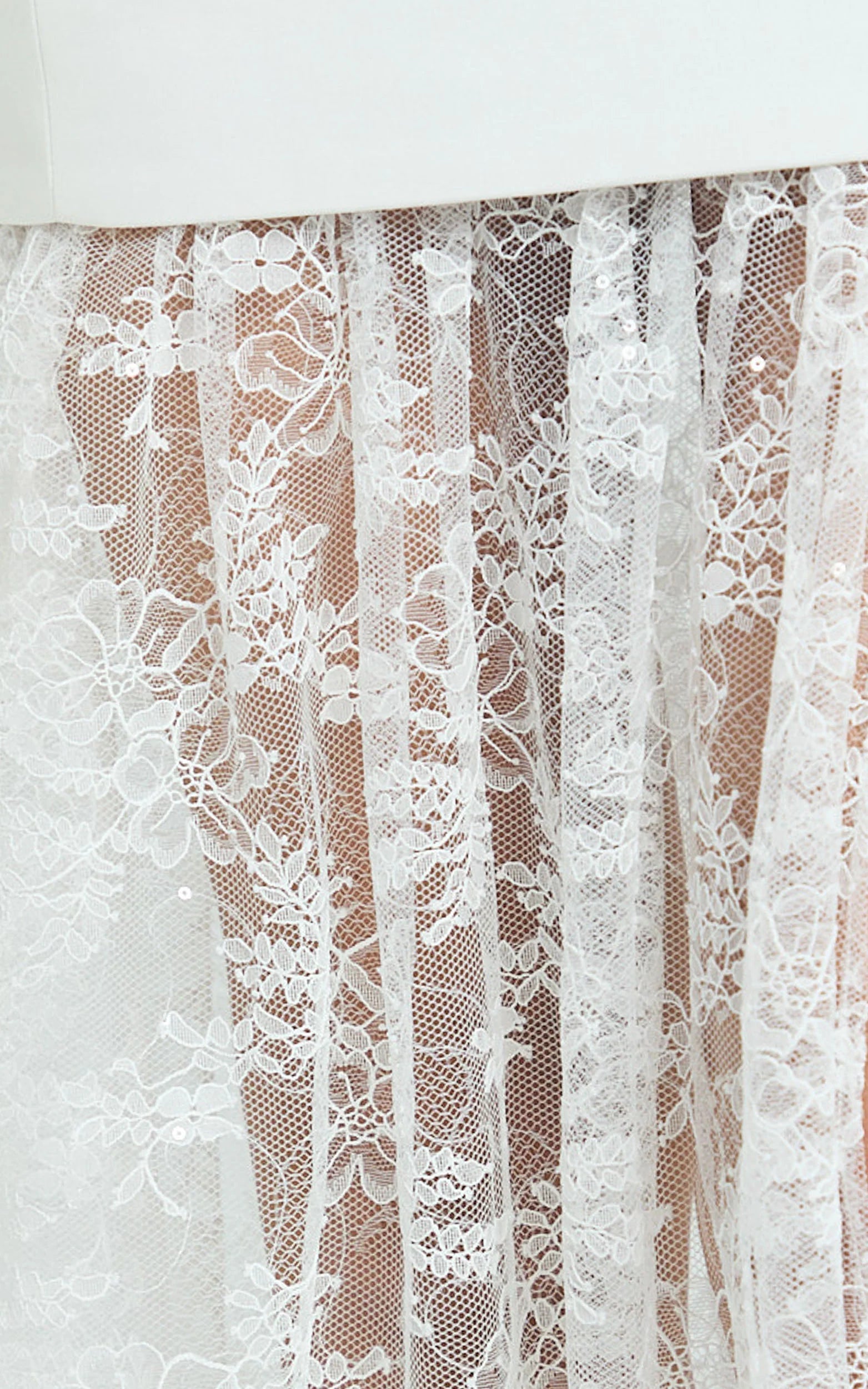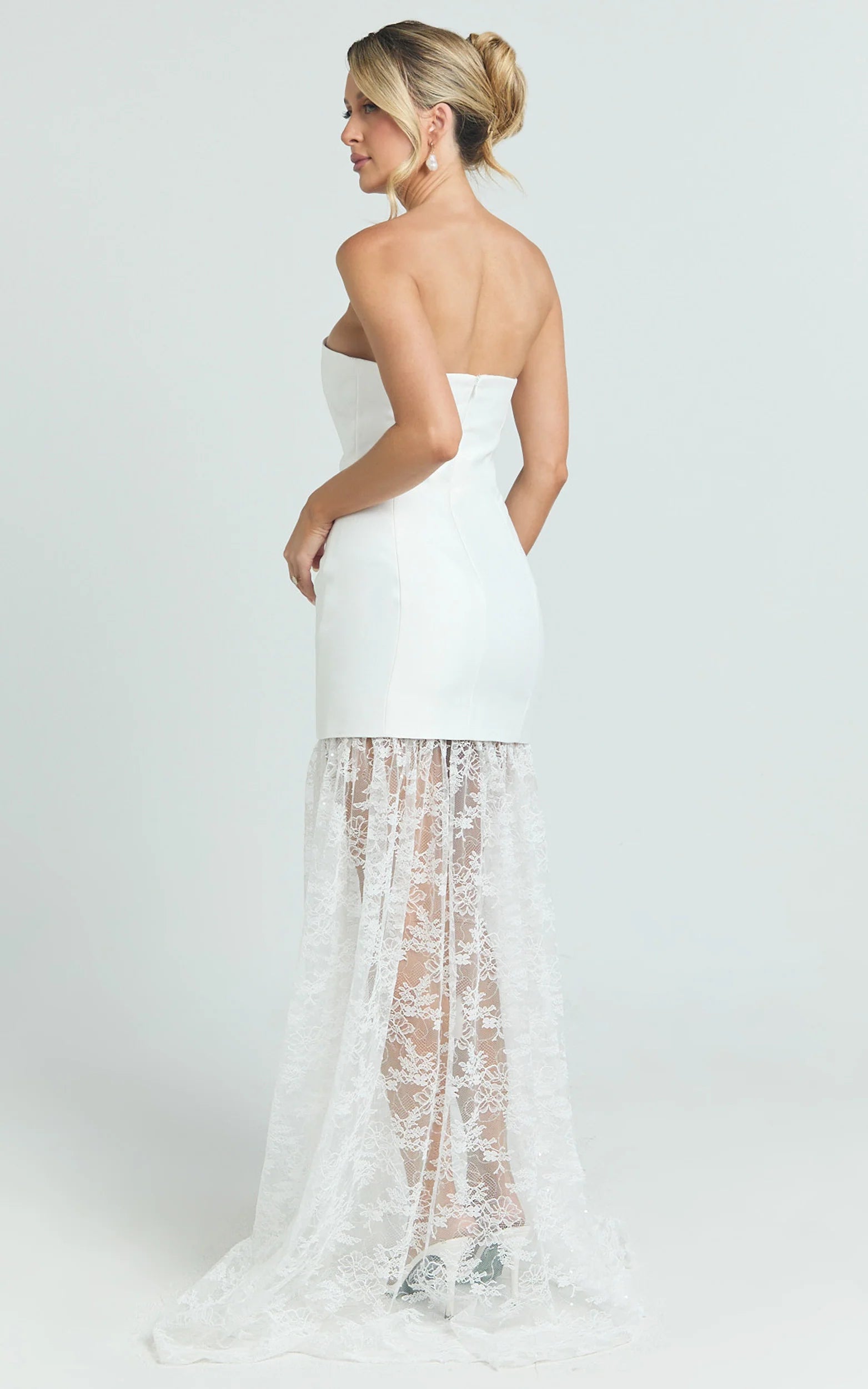 A sculpted peplum bodice defines your waist, while the lace-look skirt flows with every step, effortless, flattering, and totally photogenic. The silhouette cinches where you want it and skims where you don’t, so you feel confident from aisle to after-party.