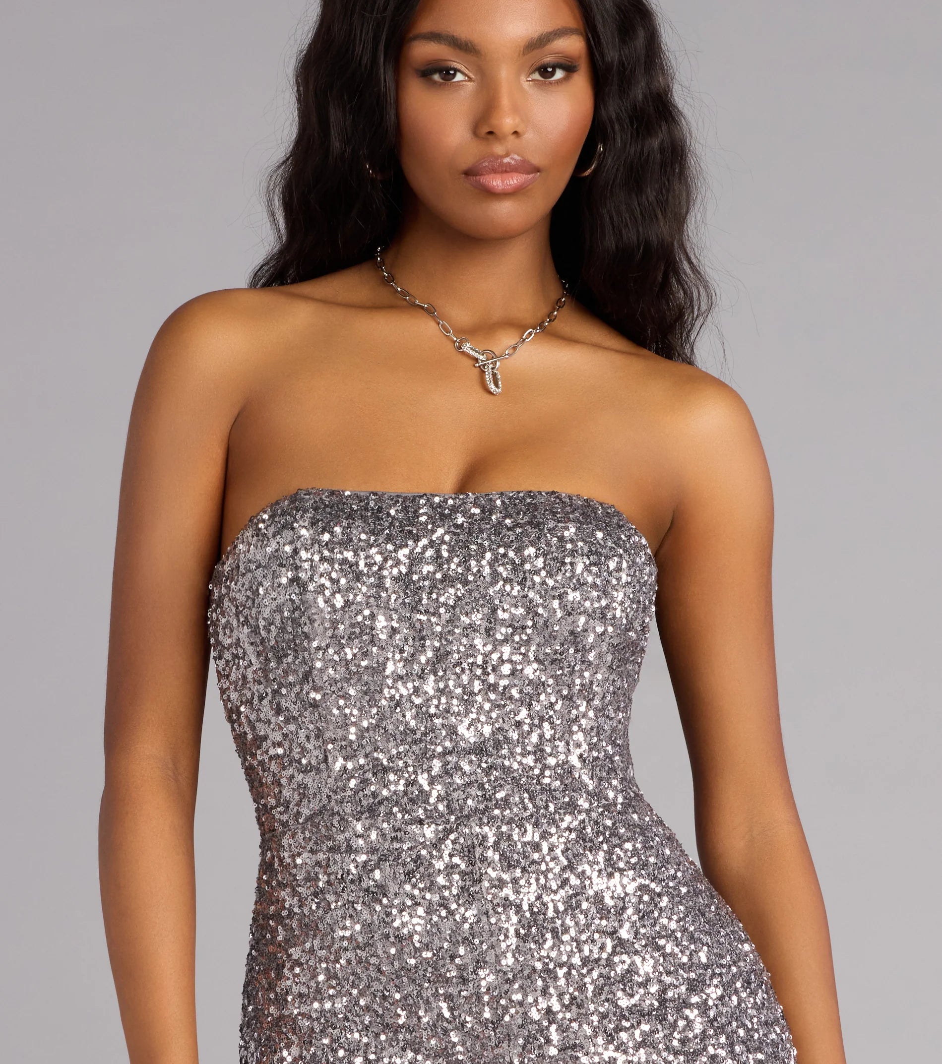 Sparkle without trying. This strapless sequin romper hugs every curve with a sleek, fitted silhouette that’s made for holiday parties, dancing at midnight, and any excuse to shine!