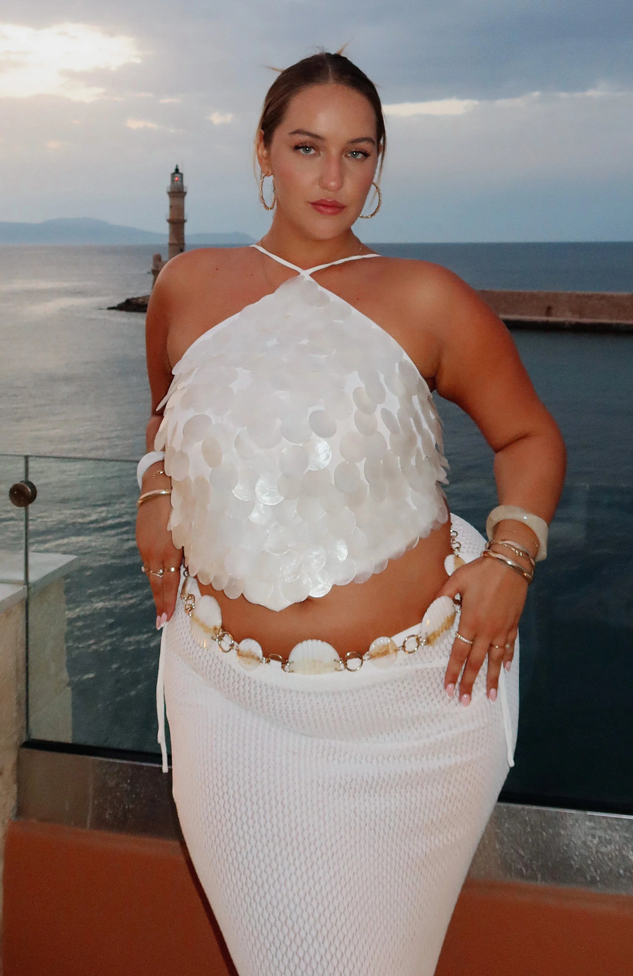 Make an unforgettable entrance in Athens Aura Shell Top in White! Features a halter neck design with self tie straps, shell detailing, lined and stretch fabrication for an easy slip on design. Complete the look with the matching Forgiven Aura Shell Mini Skirt in White.