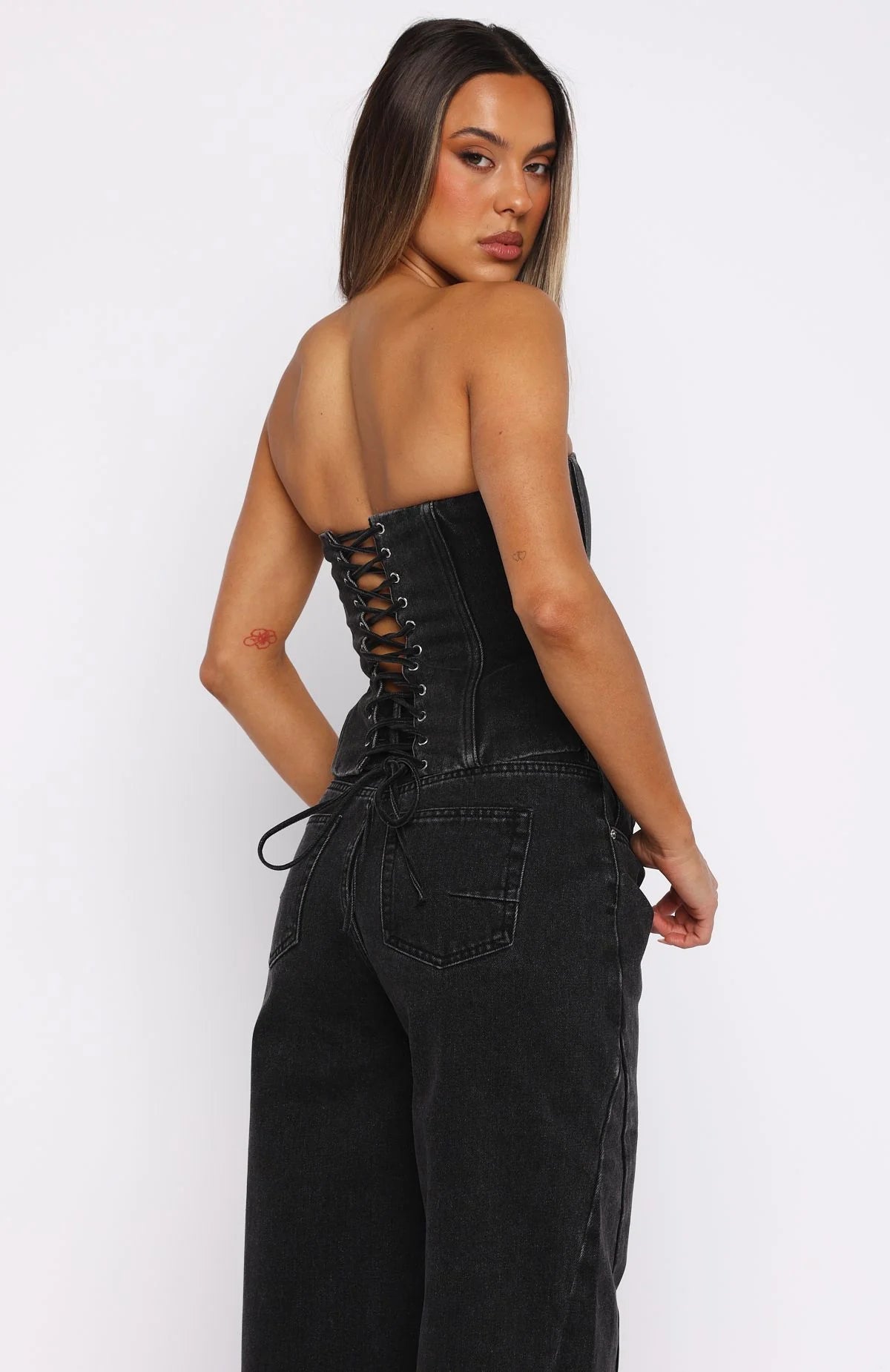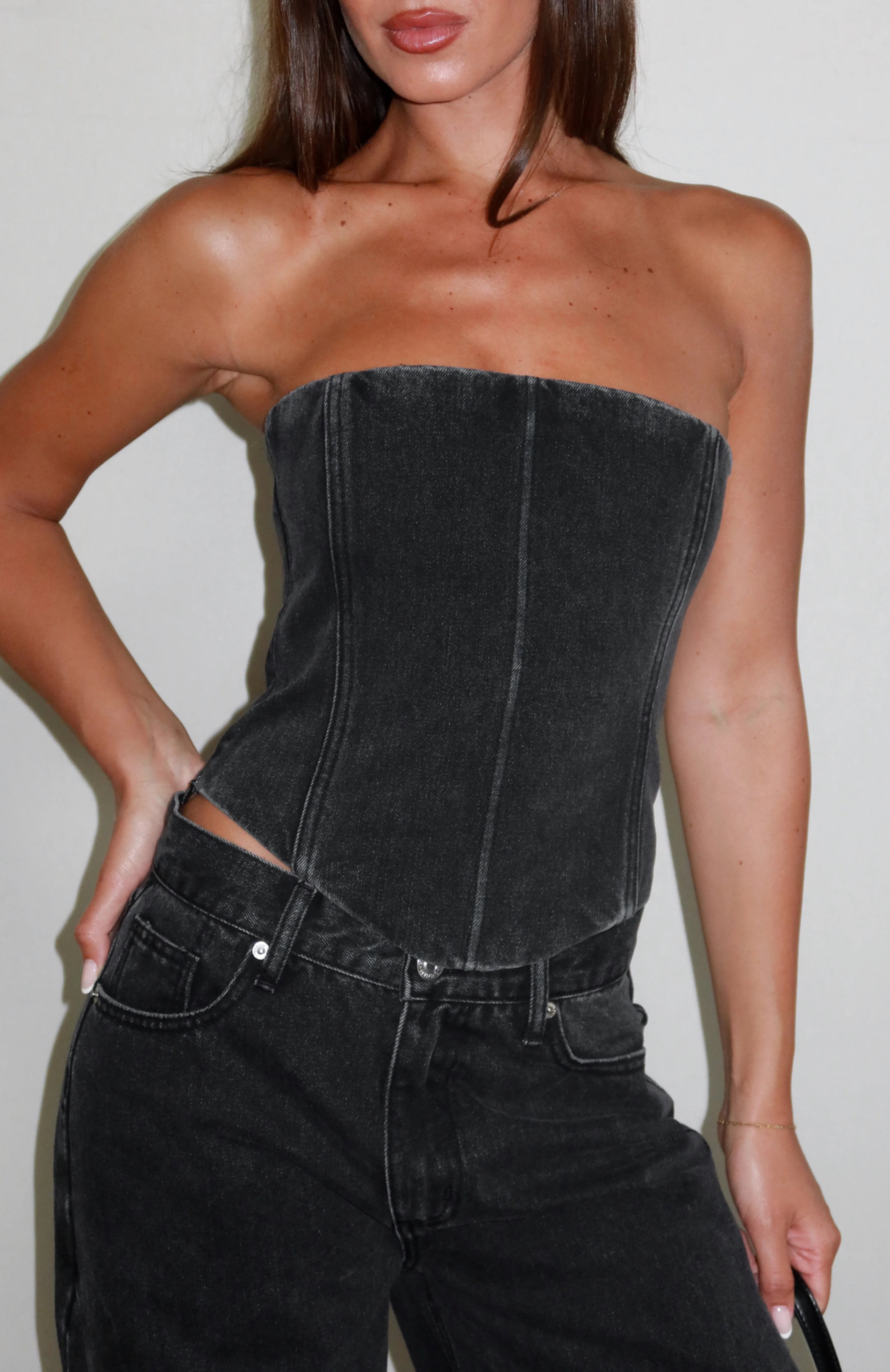 Embrace a double denim moment with the Be Mine Forever Denim Bustier in Black Acid. This strapless piece features grip tape for secure wear, a structured bodice with internal boning, and a corset-inspired lace-up back, and fully lined. Style with the matching denim jeans in Black Acid for our newest obsession!