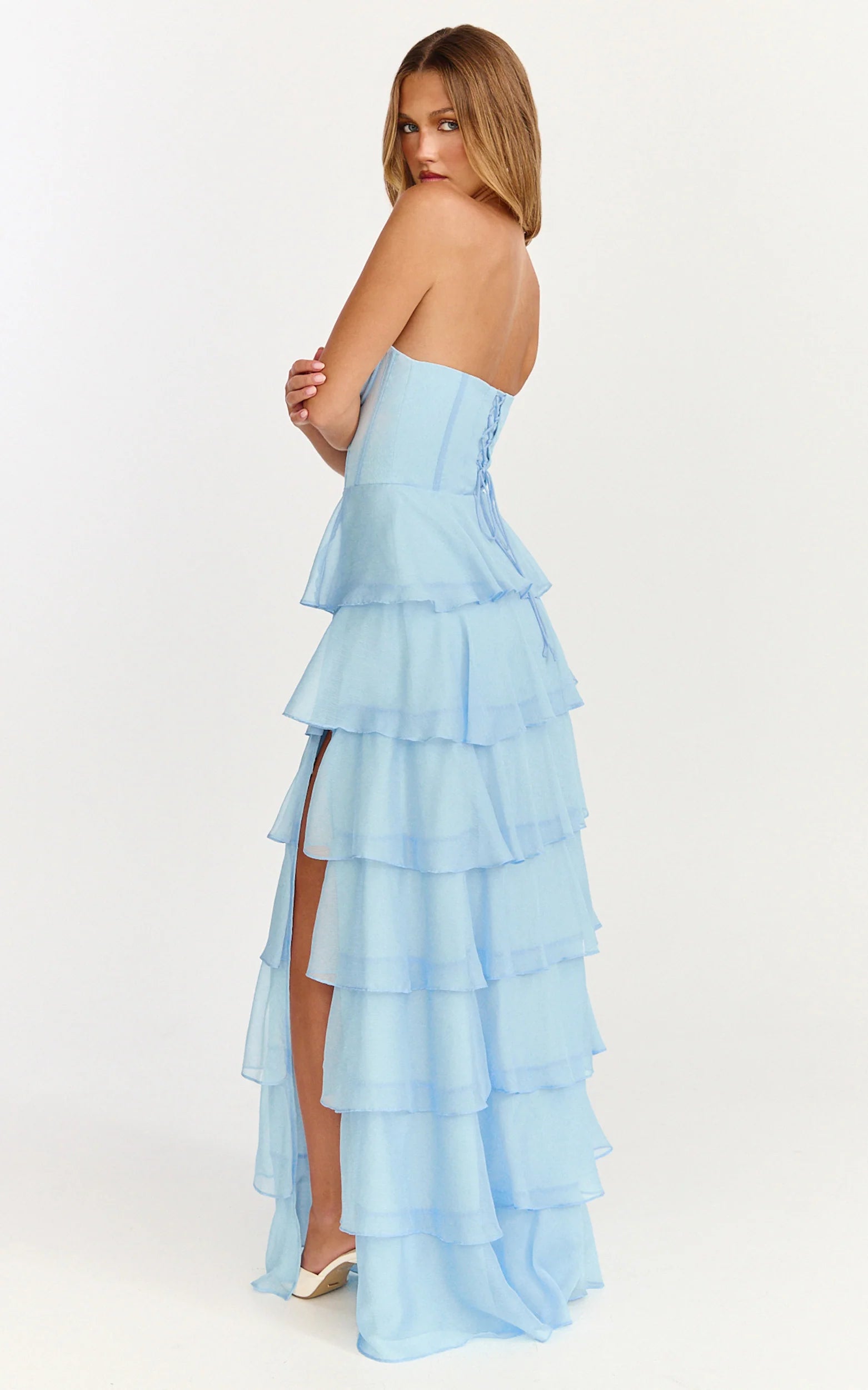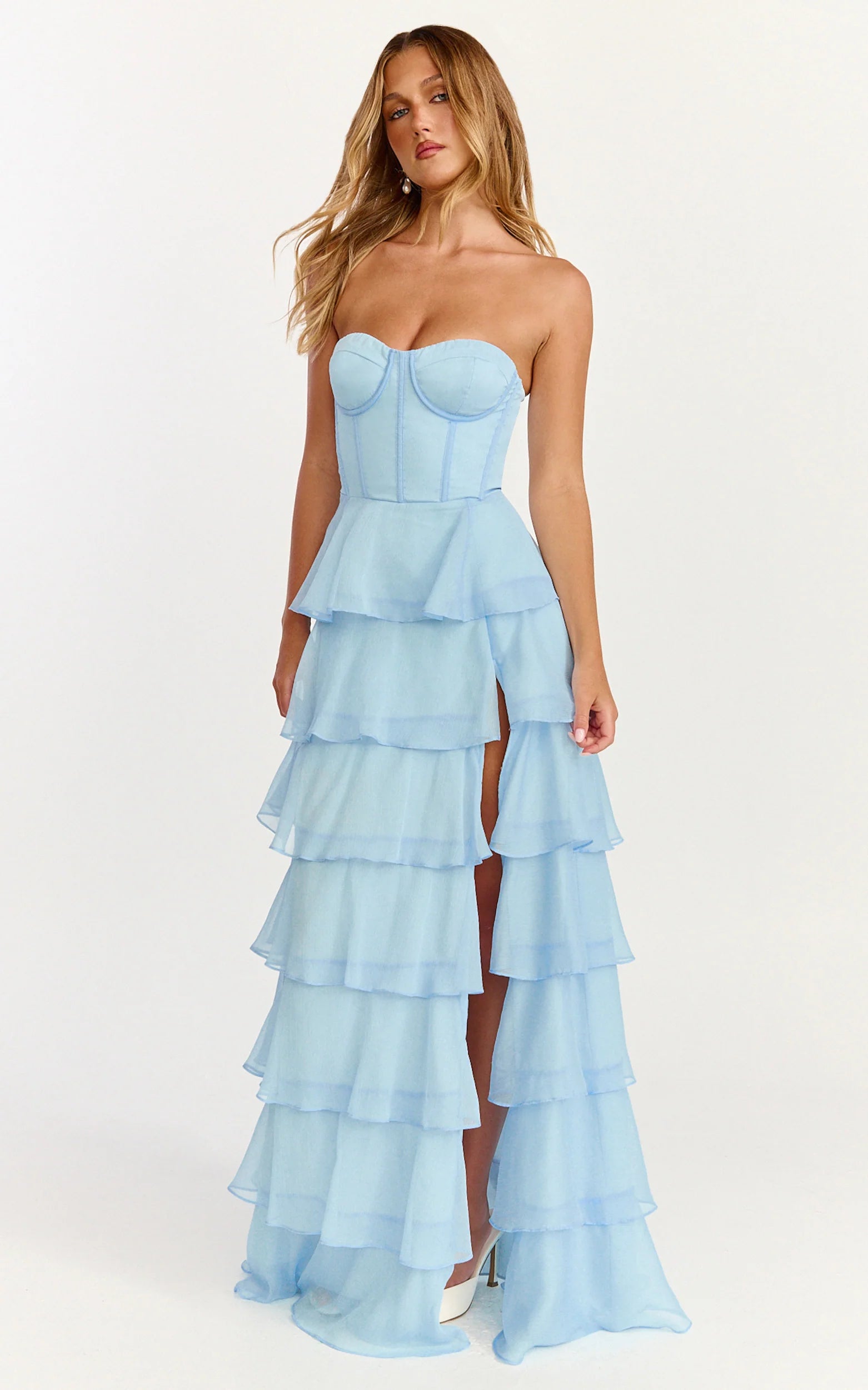 This strapless beauty cinches with a corset-style bodice, then cascades into tiered ruffles that swish with every step. The lace-up back lets you customise the fit, so you feel supported and confident from first cheers to last dance. In a soft blue hue, it’s a fresh pick for parties, weddings or any RSVP that calls for something dreamy.
