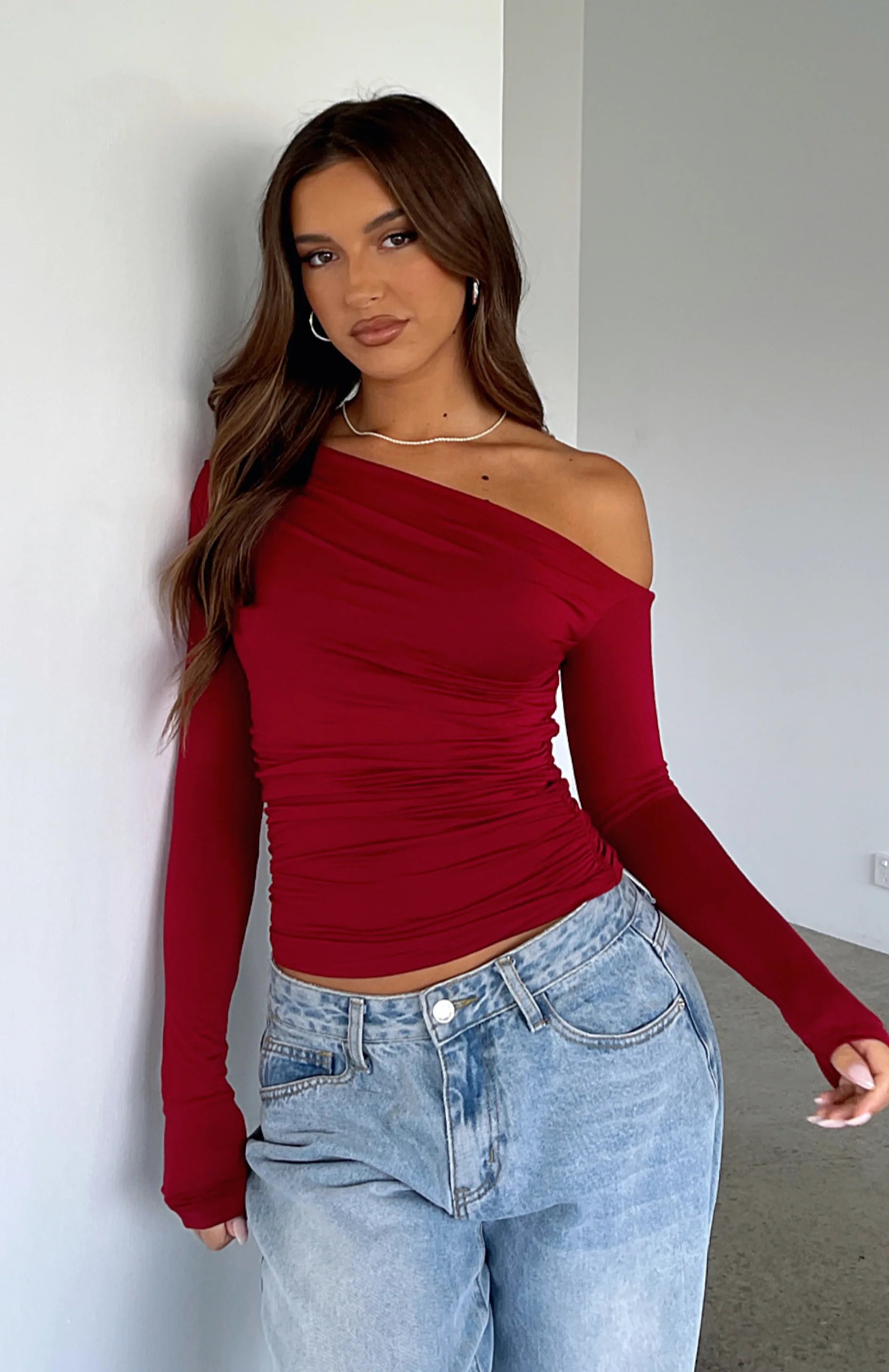 The top for that all day, everyday kind of cool with an off the shoulder style to show just the right amount of skin. The Best Of Luck Long Sleeve Top Wine features an asymmetric neckline, ruched fabric, long sleeves and ultra soft, stretch fabric with a snug fit. Pair with your go-to bottoms and a mini bag. Worthy of a casual day out or you next night out!