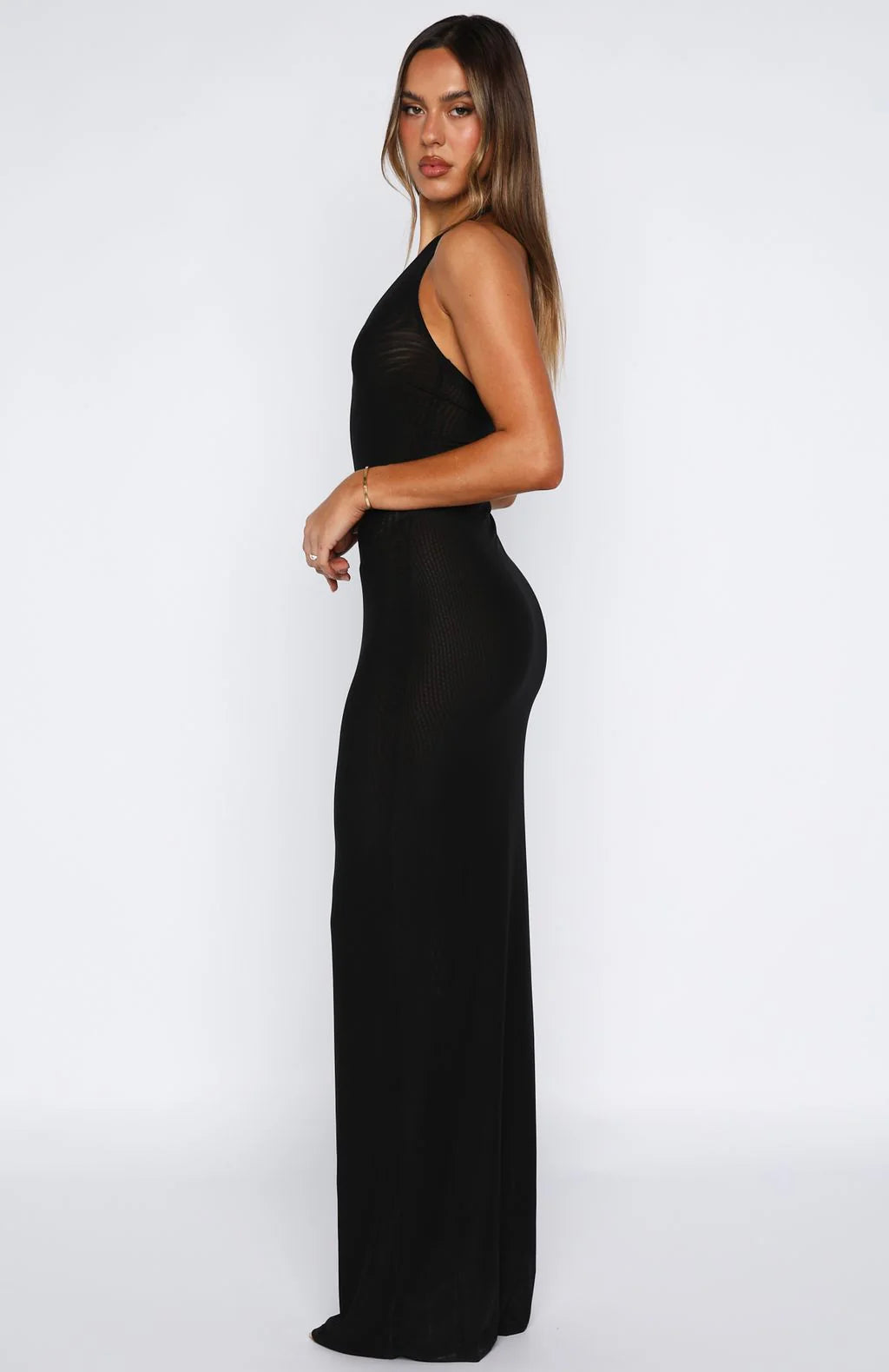 Bloom in the Bets Are Off Maxi Dress in Black. Features a halter‑neck silhouette with button-and-loop closure, provocative front cut‑out, and a backless, mesh‑lined design that’s sheer. Crafted from a high stretch fabric making it an effortless slip on and off. Let the dress take center stage pair it with perspex heels and gleaming gold accessories.