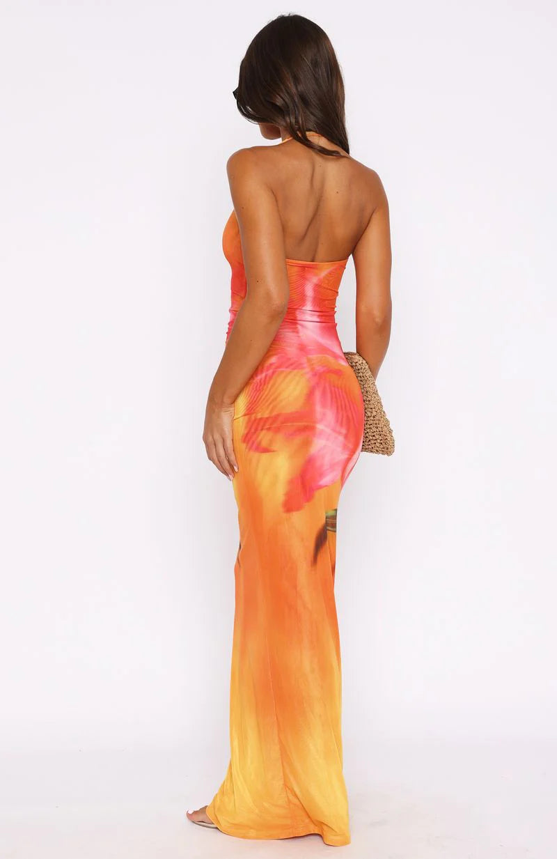 Blossom in the Bets Are Off Maxi Dress Sunset Floral. Features a halter style neckline with button and loop closure, front cut out detailing, backless, mesh lined, sheer, maxi length, and stretch material for an easy slip on design. Let the dress be the main attraction and pair with perspex heels and gold accessories!