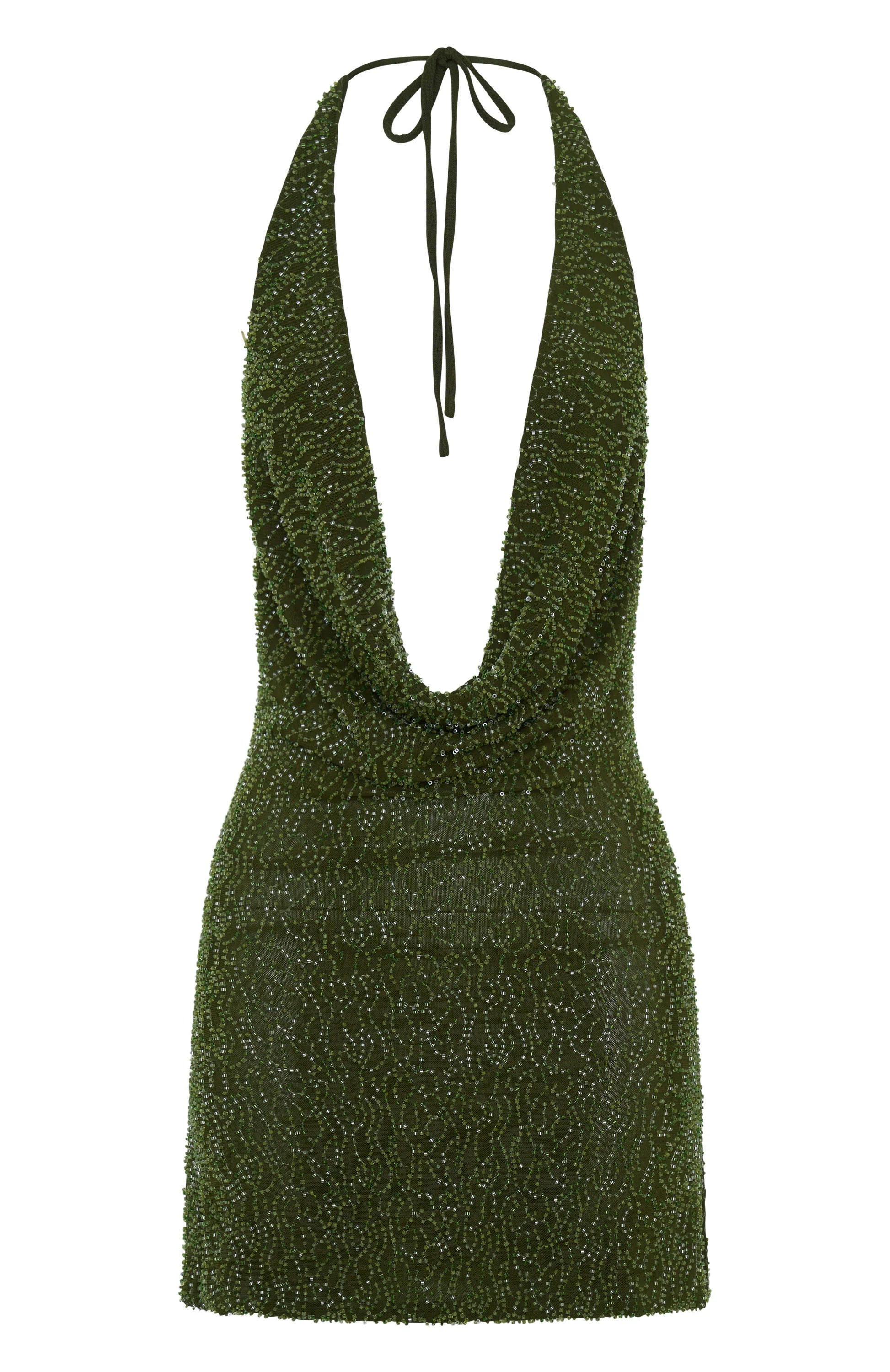 Made for after dark... the By Candlelight Beaded Mini Dress Deep Olive features a halter neck design with self tie strap, front cowl detailing, mesh lined, slightly sheer, backless with self tie strap, mini length and stunning beaded material.