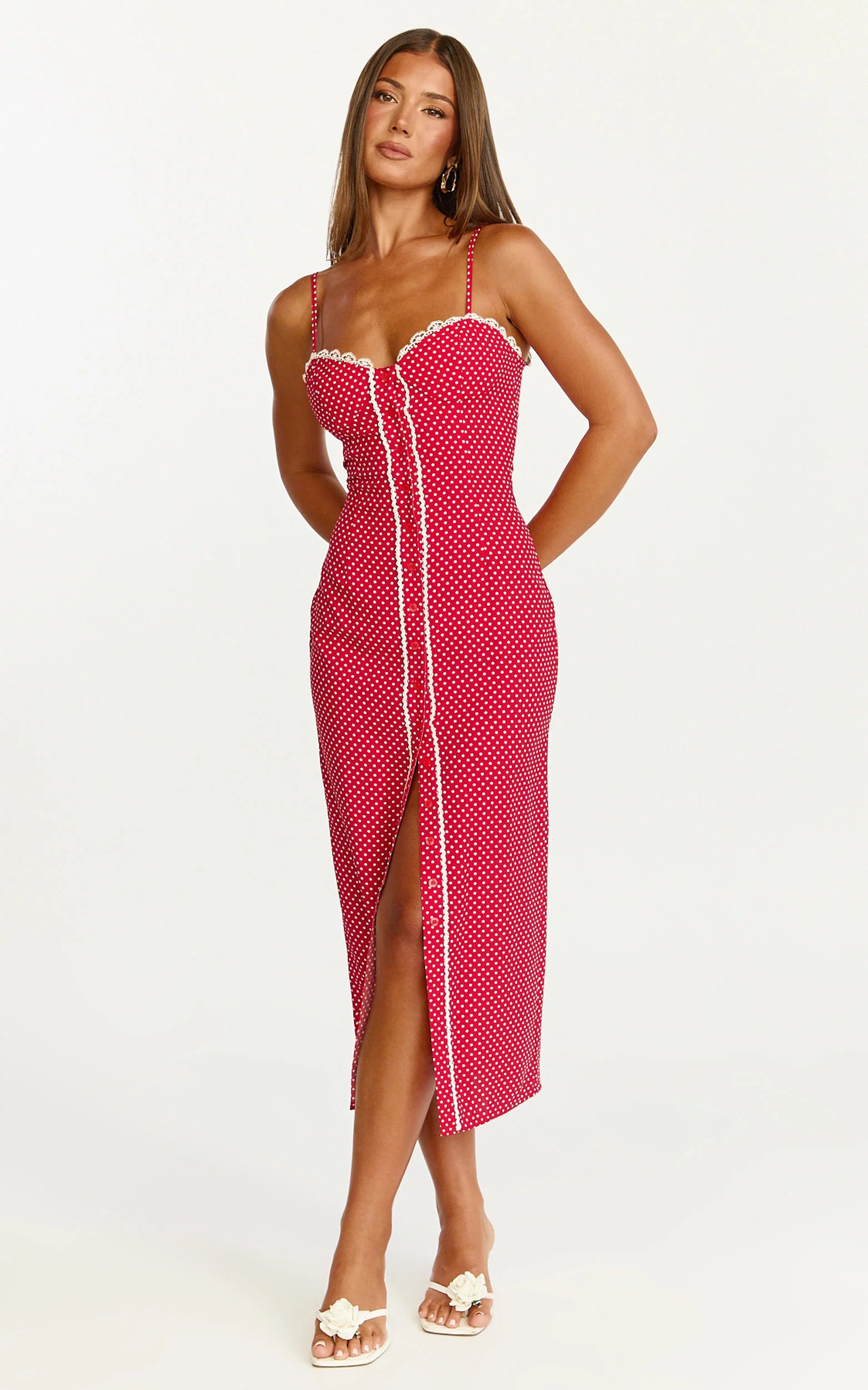 A fitted bustier bodice defines your shape, while a button-front detail and delicate lace trim add that flirty finish. The streamlined silhouette skims to a midi hem for a polished, feminine look that works from date night to dance floor and every RSVP in between.