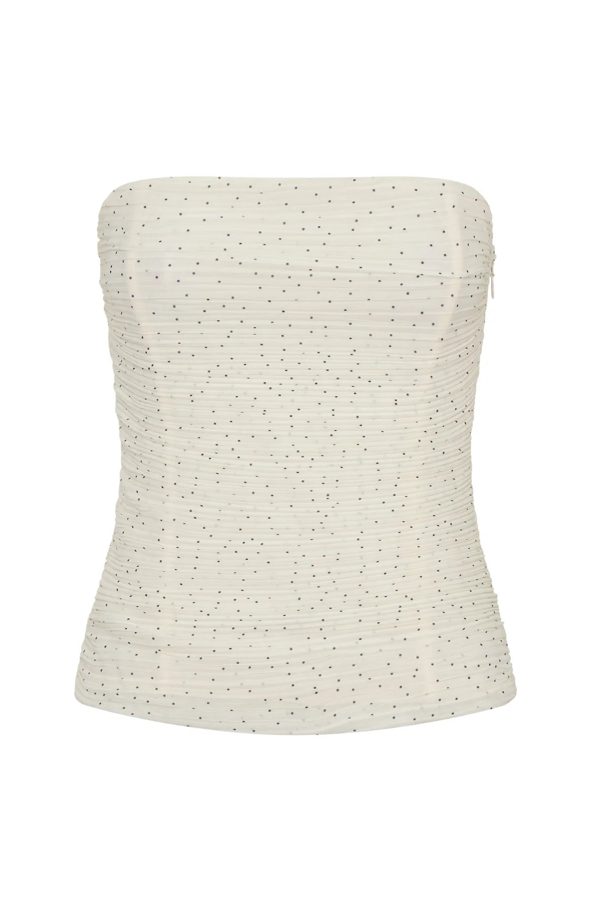 In a summer state of mind! The Camp Crush Strapless Bustier in Cream/Black Polka Dot features a strapless neckline with grip tape, internal boning, and subtle side ruching for a flattering fit. The fitted silhouette is complemented by an invisible side zipper with hook-and-eye closure, and the top is fully lined for comfort. Style with capris, kitten heels and sunnies for a chic summer fit.
