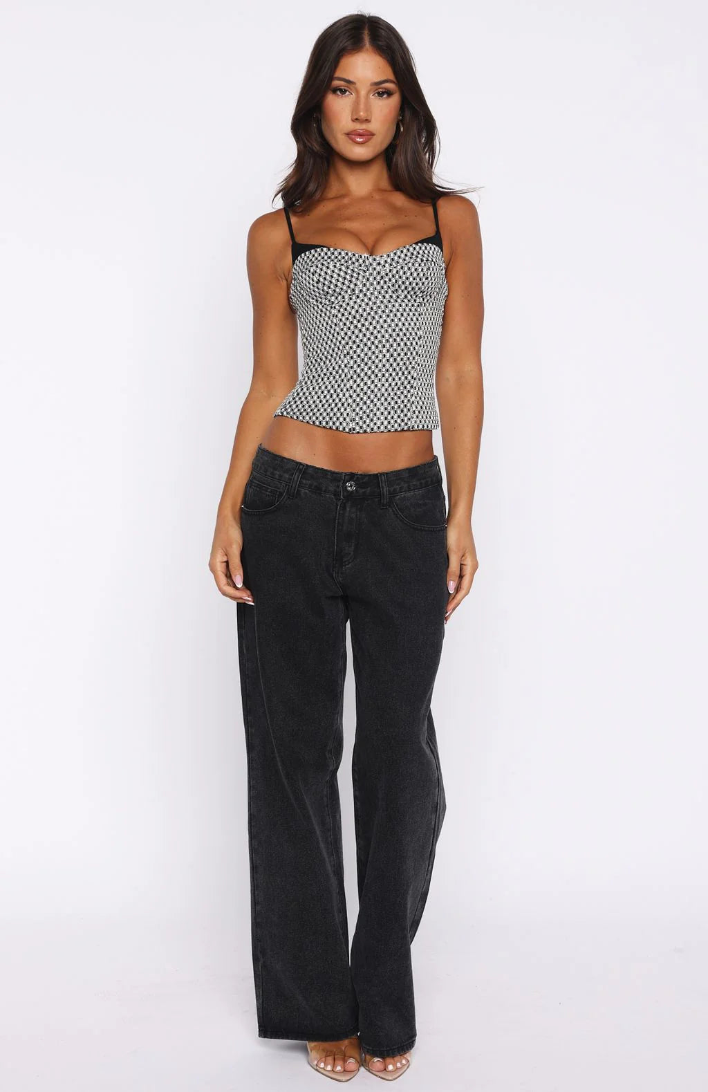 The chic girlies get it! The Can't Escape Bustier in Black/White is crafted from bold checkered texture fabrication —because standing out should feel effortless. Thin, adjustable spaghetti straps meet a flattering sweetheart neckline, while structured boning shapes the bust and hugs the figure. Finished with a back zipper ensuring a seamless finish. Pair with your fav denim jeans, kitten heels, layered gold jewellery and a shoulder bag.
