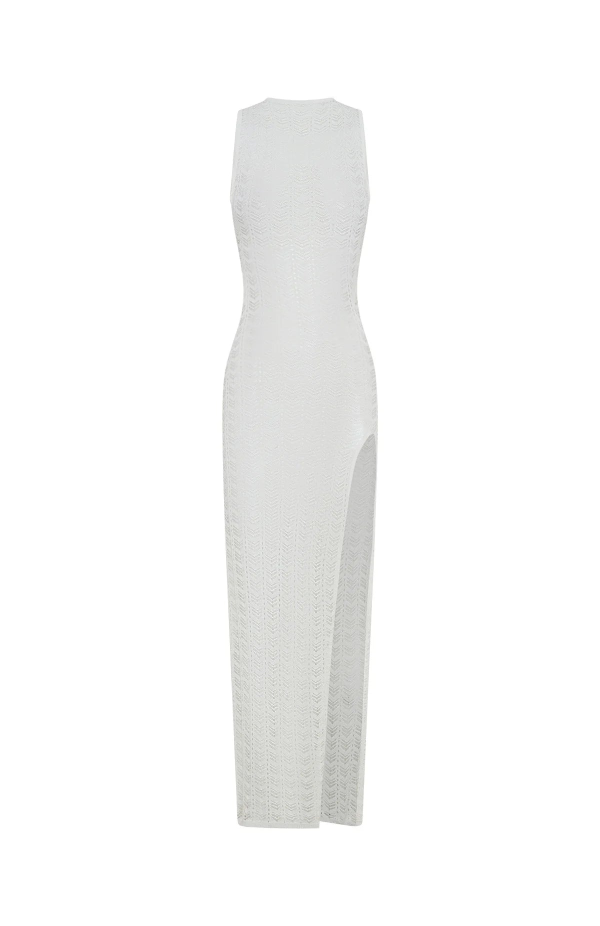 Designed for the wild at heart...The Can't Stop Won't Stop Knit Maxi Dress Off White features a high-cut neckline, thick shoulder straps, back adjustable tie design, maxi length, high side split and unlined, sheer material. Pair over a white bikini for a night filled with fun and memories.