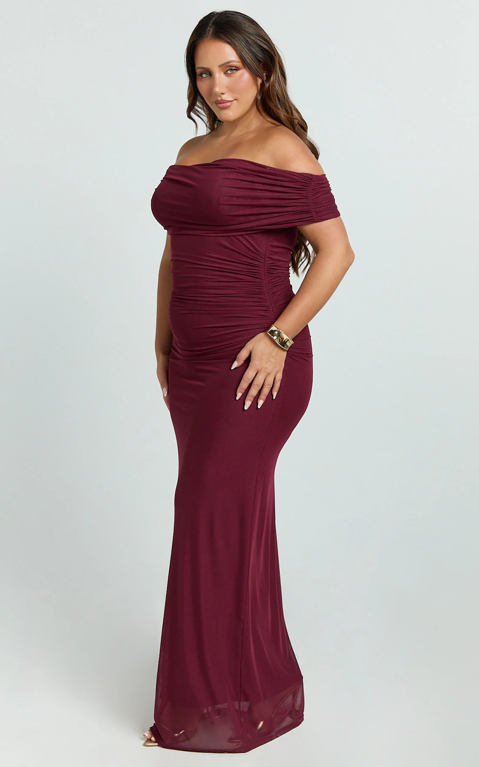 Caterina Maxi - Ruched Off Shoulder Mesh Dress In Wine elevates your Dresses rotation with a romantic off-shoulder neckline and body-loving ruching that moves with you. Pair with crisp shirting draped over your shoulders for a cool contrast, or add a statement clutch and let the wine tone do the talking. Trending now: strappy sandals and crisp shirting, two effortless ways to seal the look.