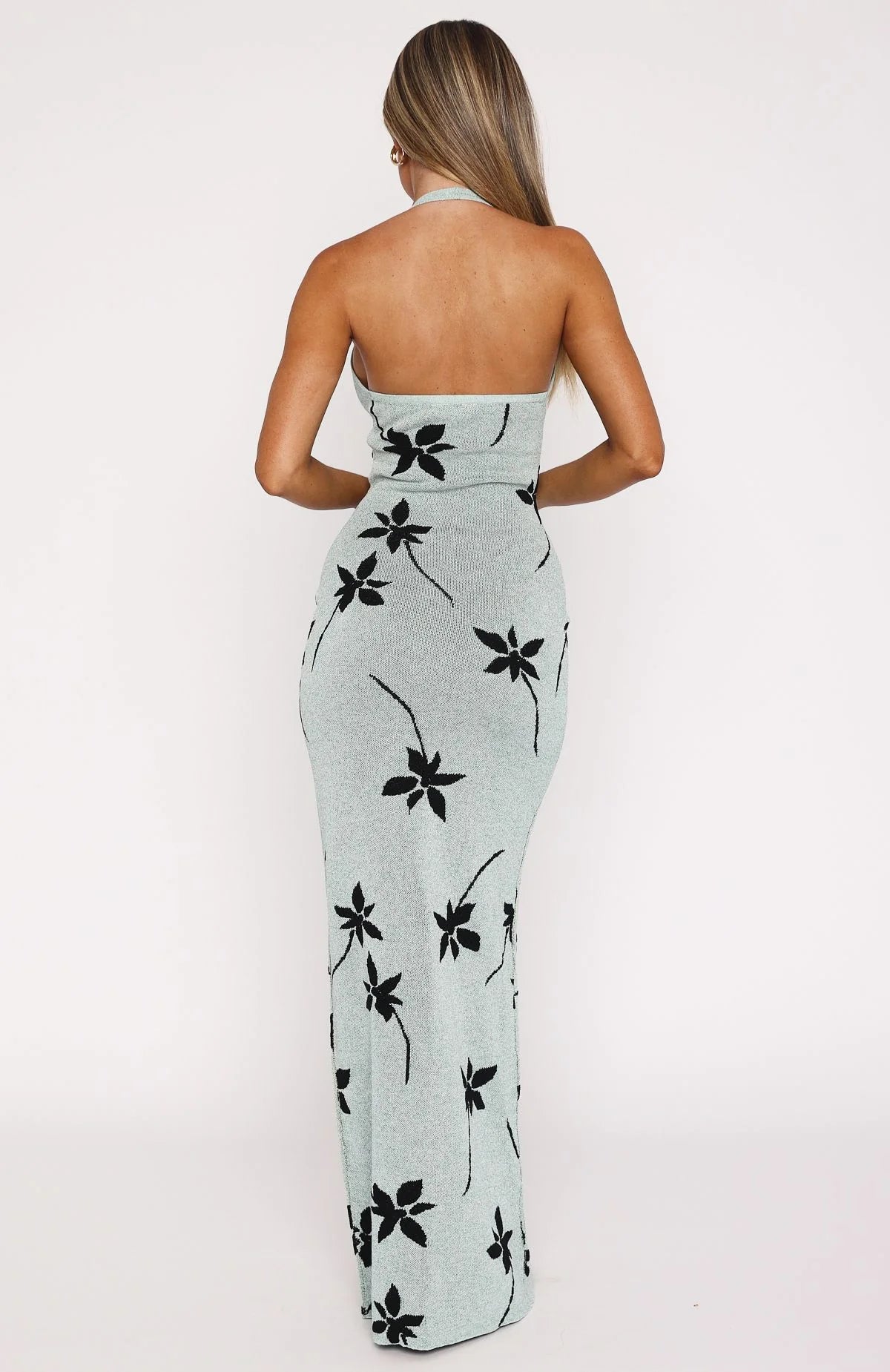 Sunsets and the Chasing Heaven Knit Maxi Dress Mint are a match made in paradise! Features a halter neck design, low plunge neckline, slightly sheer, tinsel embellished for a slight iridescent glow, maxi length, stretch material for an easy slip on design and a figure hugging fit.