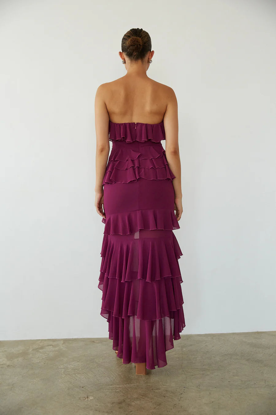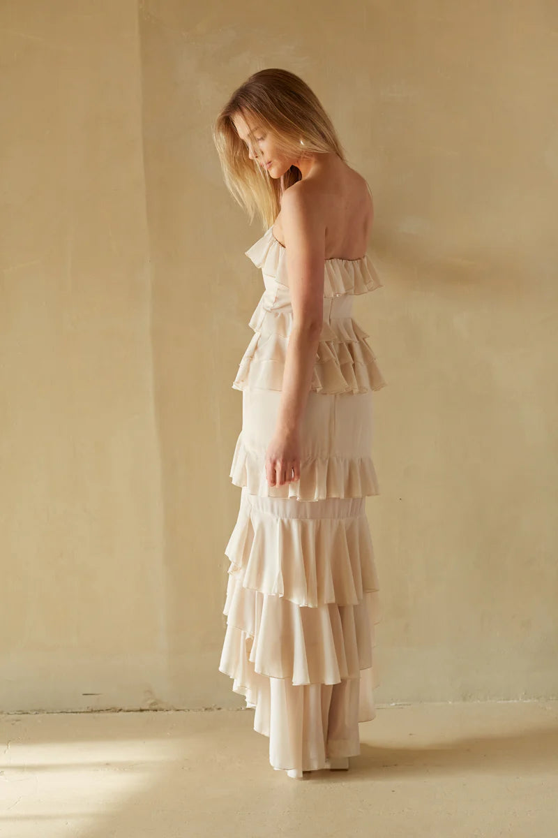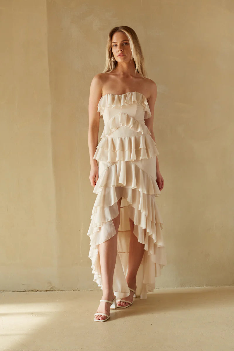 They'll be falling in love when they see you in the Clementine Strapless High Low Ruffle Maxi Dress! This elegant dress features a strapless sweetheart neckline, boning in the bust for structure, a ruffle trim, tiered ruffles throughout, and a high-low hem. Finish off the look with some simple !