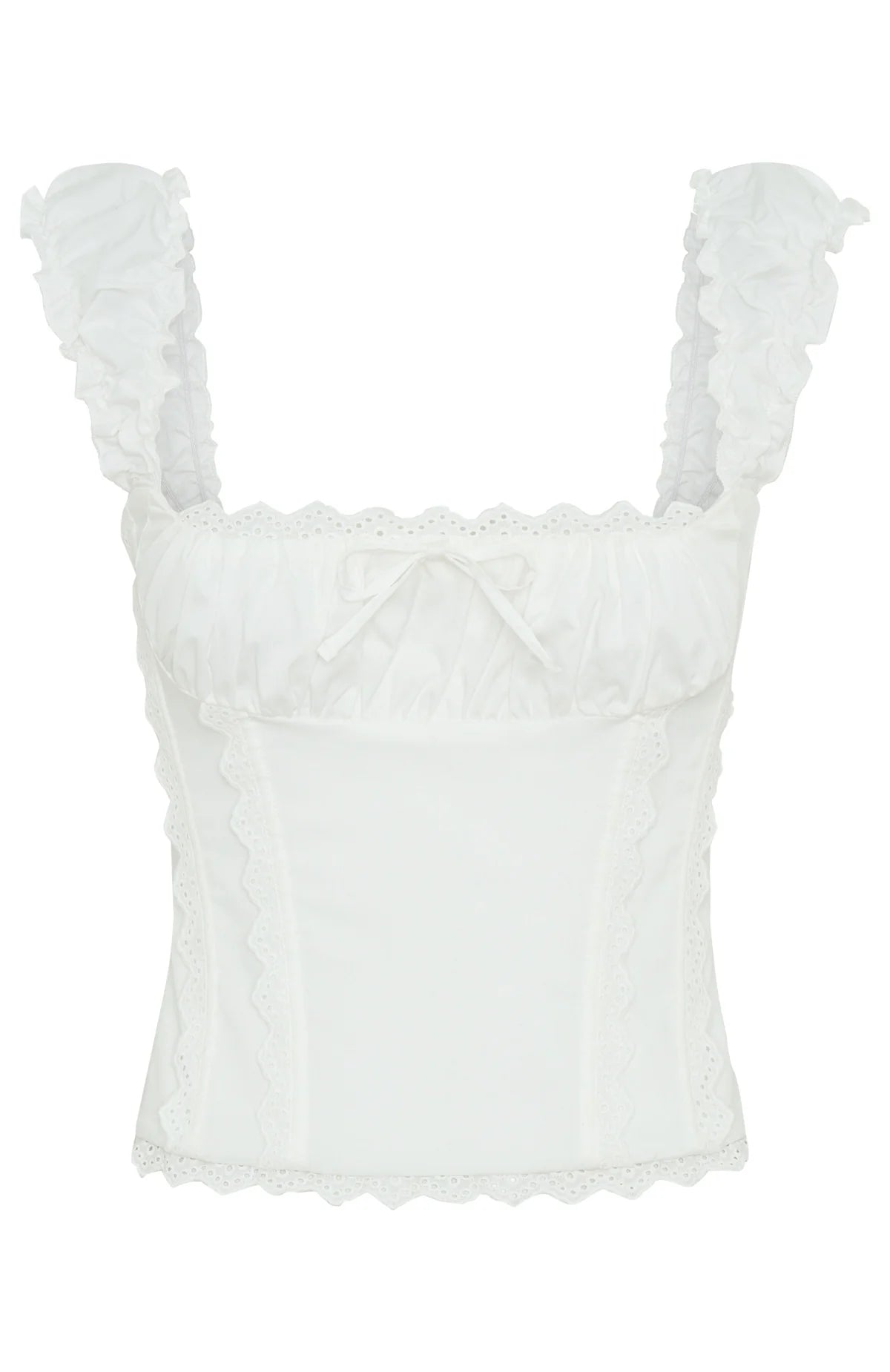 Girly girls you are going to be obsessed with the Coconut Oasis Top in White! Features thick shoulder straps with ruffle detailing, square neckline, bust shaping seam for a secure fit, built-in boning that defines the waist, lace detailing on bodice, bust line and bottom hemline, lined and invisible zipper with hook and eye closure. Pair with the On The Inside Booty Shorts for the cutest look!