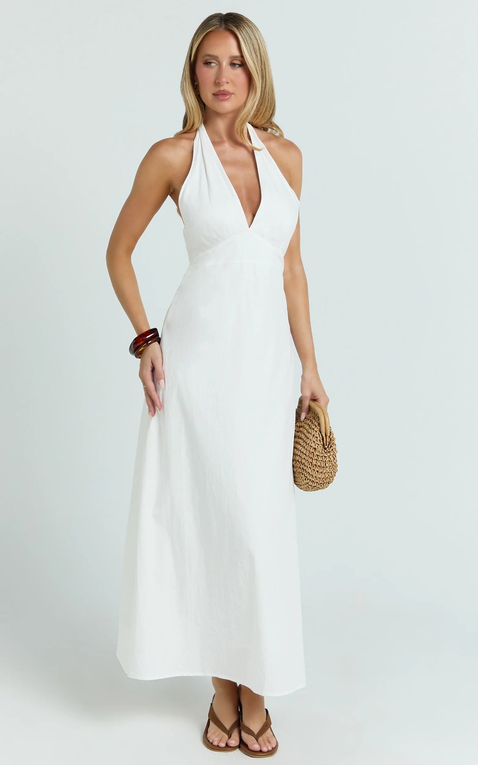 The Connor Maxi Dress in White is effortless elegance in motion. The halter neckline shows off your shoulders, the open back brings just the right amount of flirt, and the soft, flowy silhouette skims the body without clinging. It’s the perfect white maxi for beach weddings, long lunches, and sunset dates - simple, striking, and so easy to wear. Keep the styling clean with layered pendants and slicked-back hair, or lean into coastal energy with woven accessories and minimal sandals. For nights out, switch to strappy heels and gold hoops and let that open back do the talking. Fresh, modern and endlessly versatile, Connor is the white dress you’ll keep coming back to.