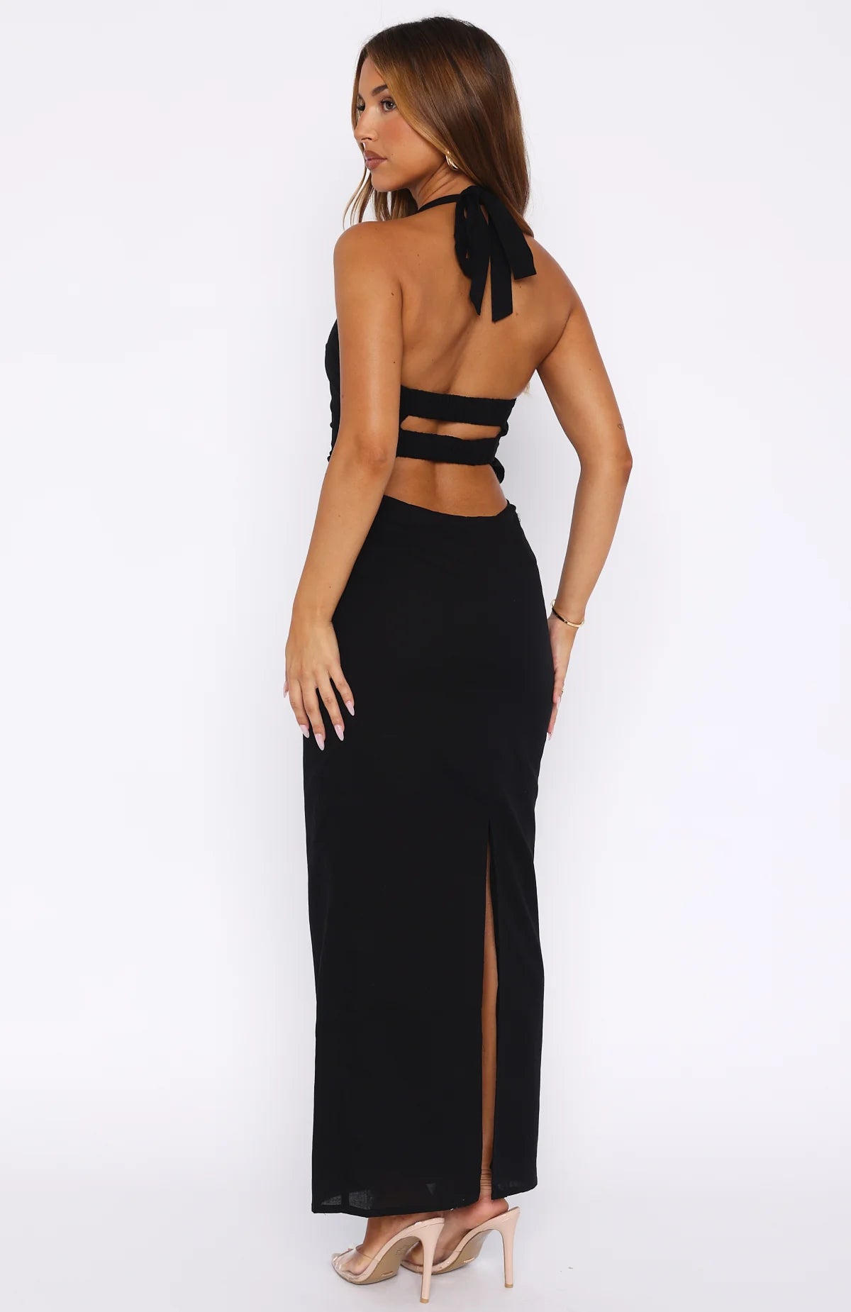 The Counting On It Halter Maxi Dress Black features a halter style neckline with self-tie straps, straight cut neckline, backless design with a double panel design, hidden side zipper with hook and eye, lined fabric, ruched side design and a flattering hugging fit for a look we adore.