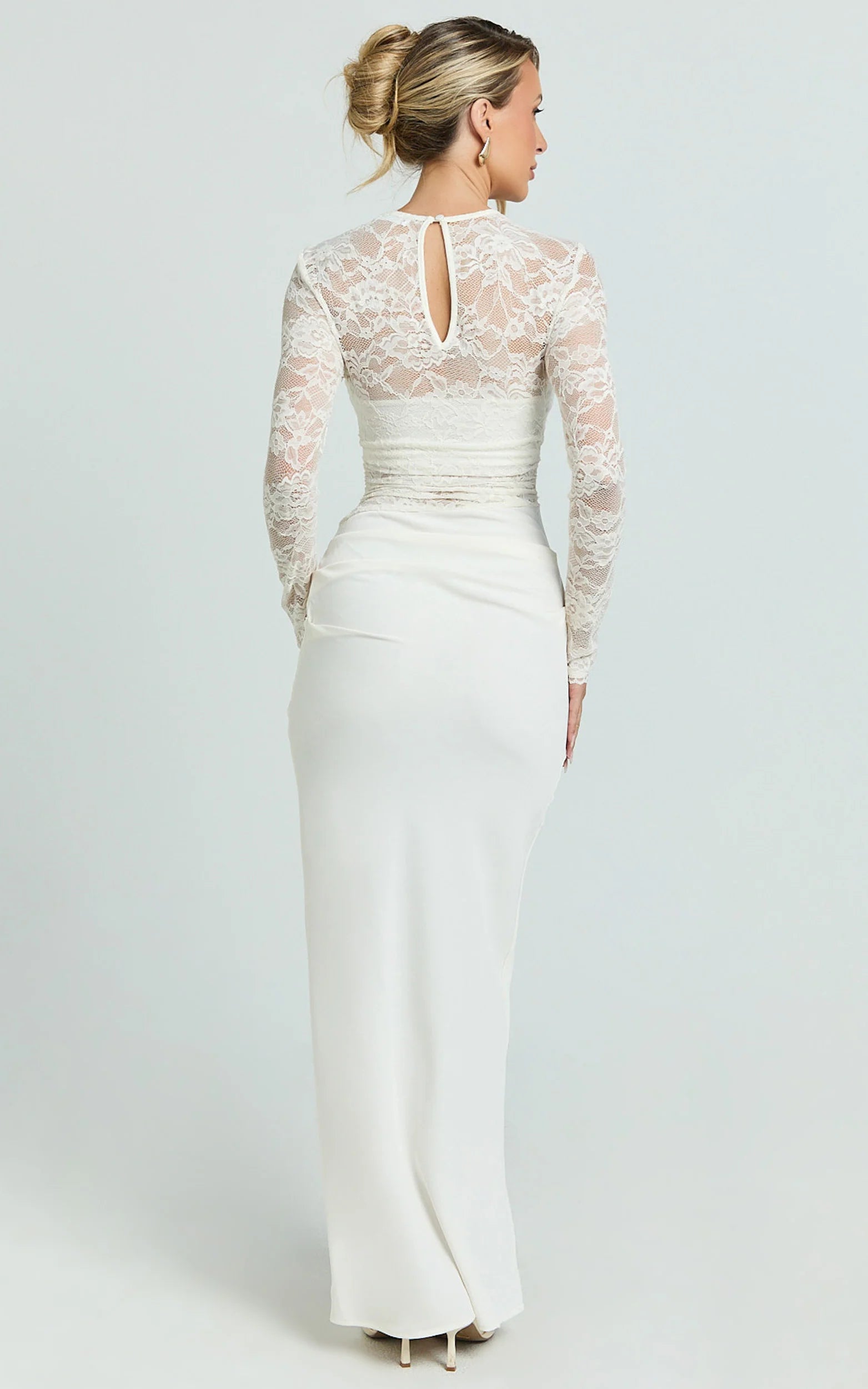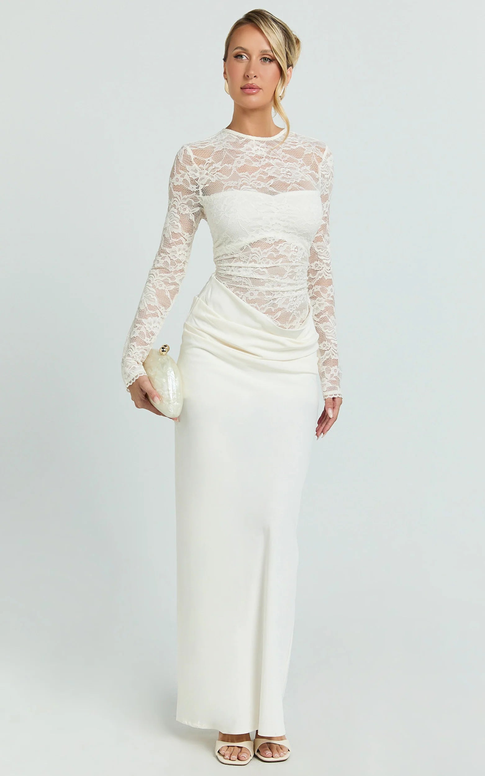 We’re here for every body and every vibe, style your dresses your way and own the moment in the Crisanta Maxi Dress - Long Sleeve Contrast Lace Bodycon Dress In Ivory.