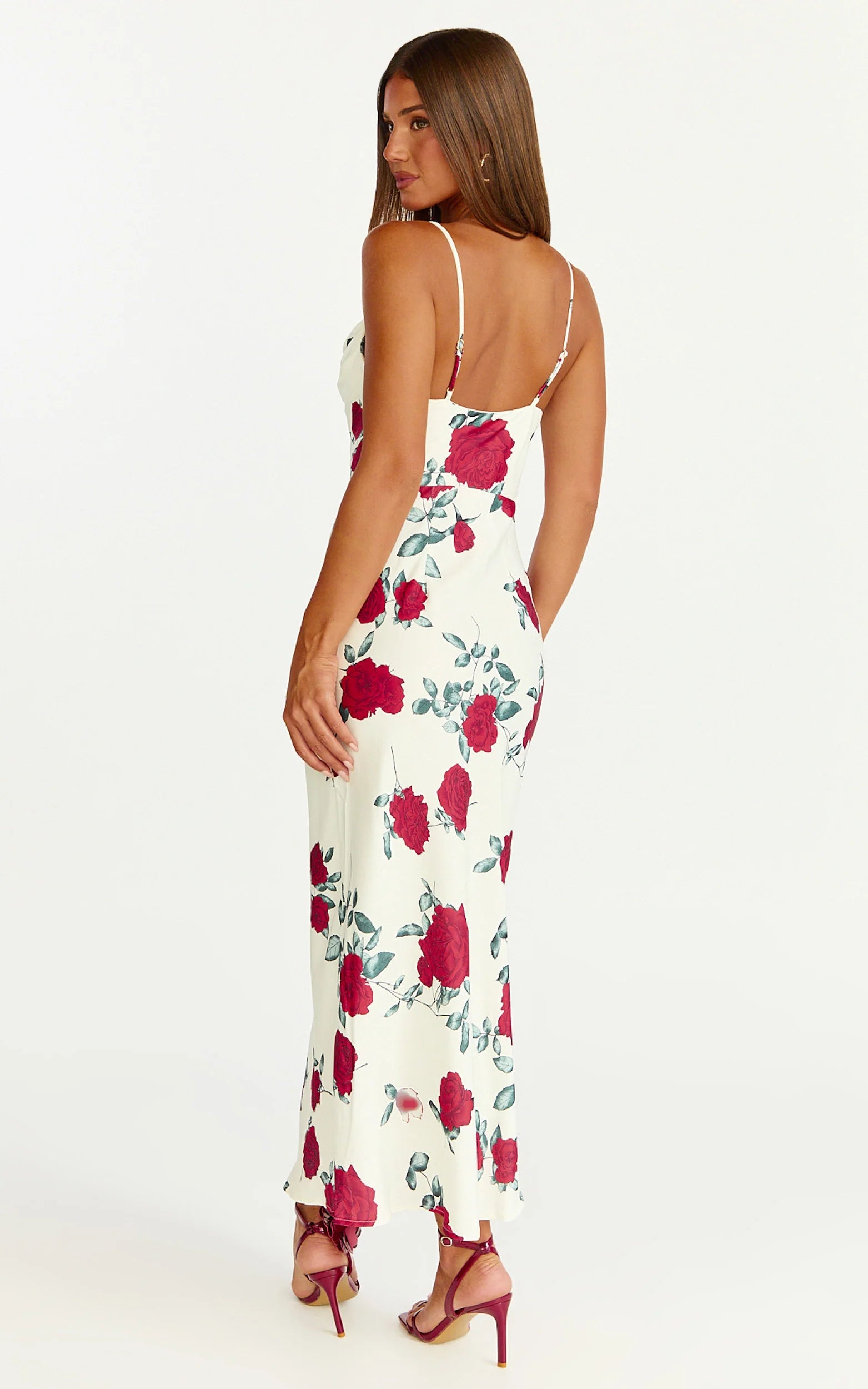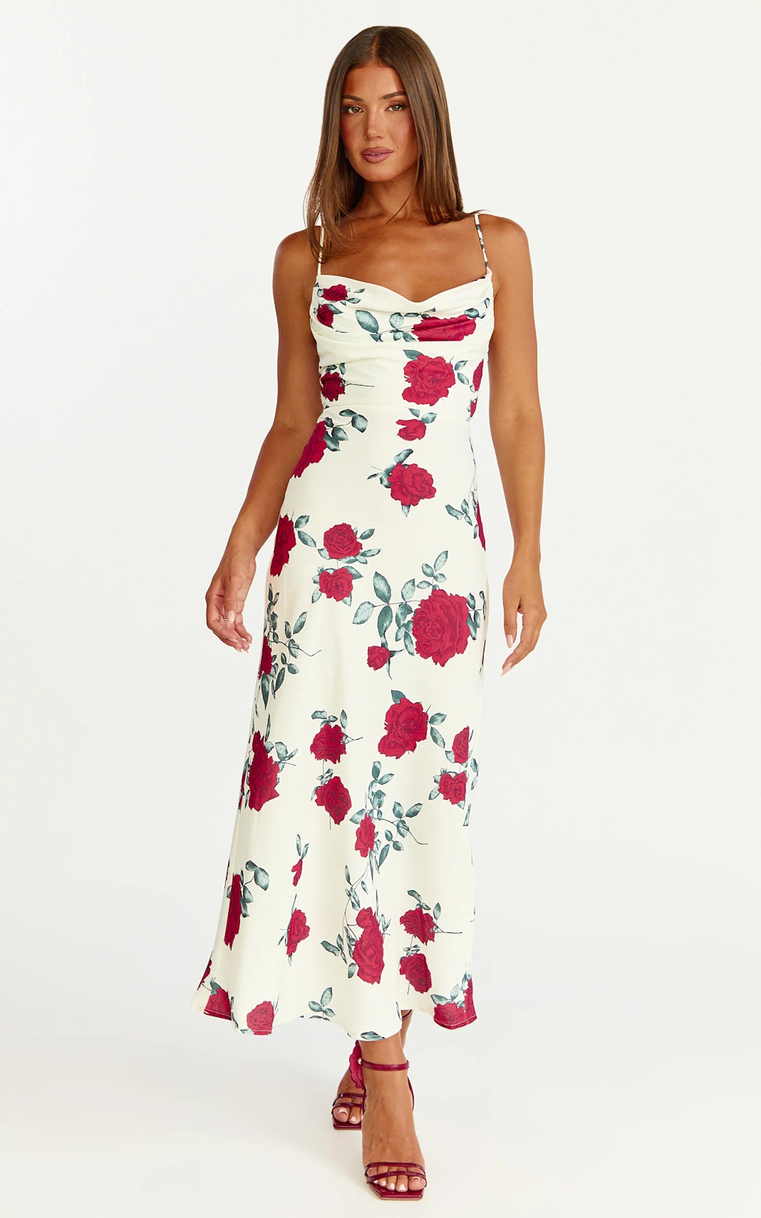 This midi brings romance with a draped cowl neck, A-line silhouette and a sweep of scarlet rose print that skims and flatters. The fit is easy, the vibe is confident, perfect for date nights, weddings and every RSVP that calls for a little extra.