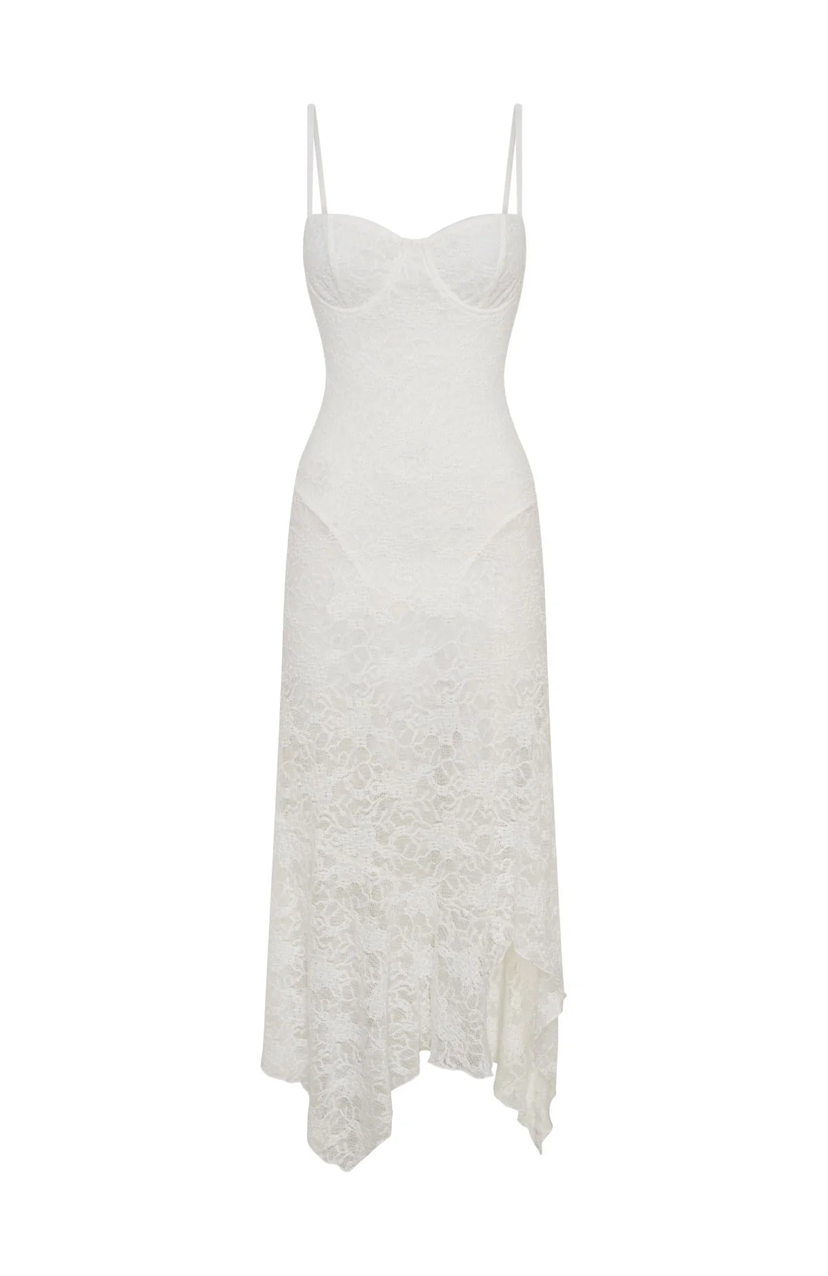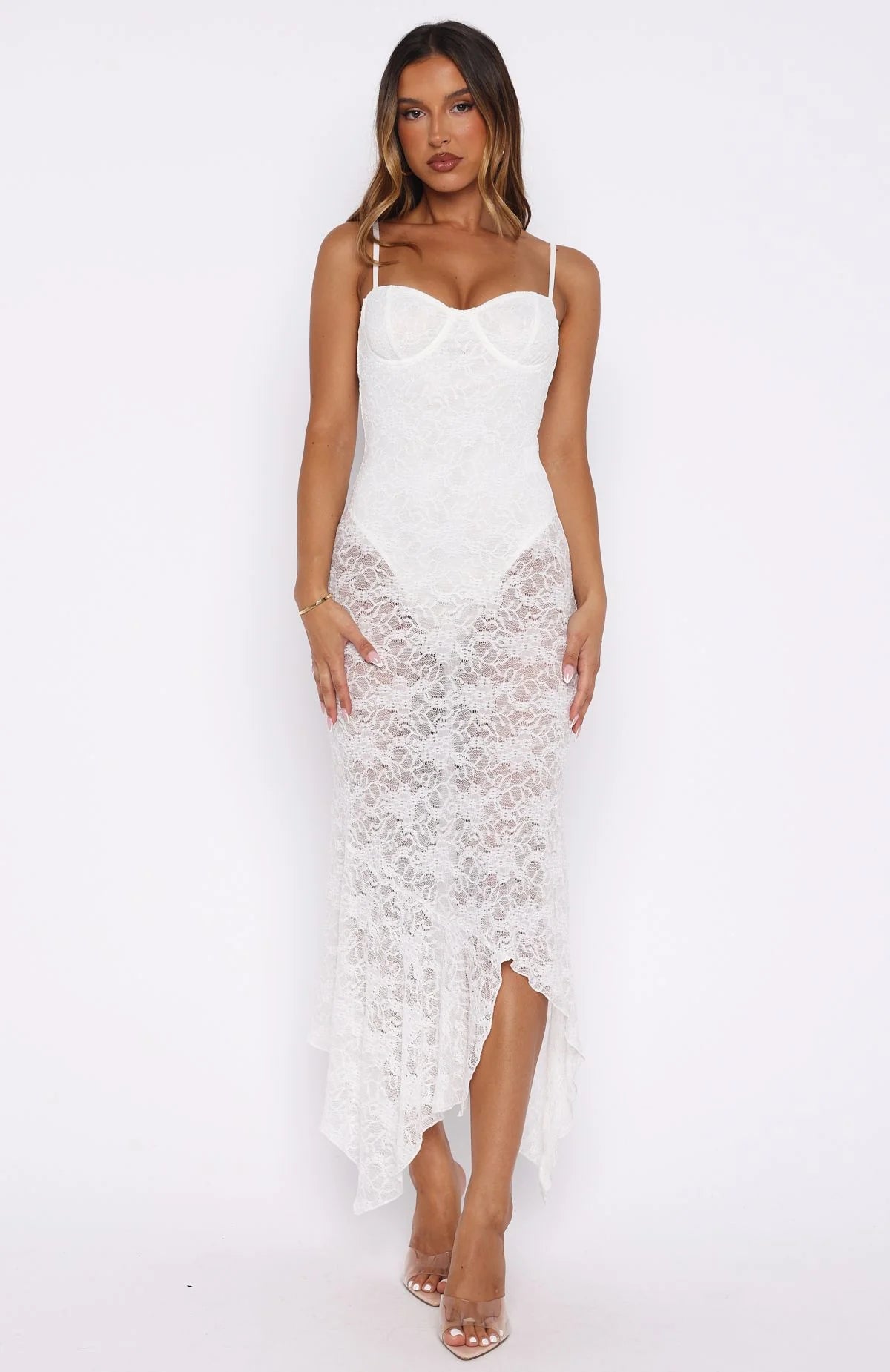 Hot day, hotter you in the Darling Girl Midi Dress in White! Features thin adjustable straps, a sweetheart neckline with under‑wire bust cups, a built‑in bodysuit with hook‑and‑eye closure at crotch, sheer lace throughout, an asymmetrical hemline, and an invisible back zipper with hook‑and‑eye closure for a flawless finish. Style with kitten heels and layered gold jewellery while sitting back enjoying endless summer sunsets.