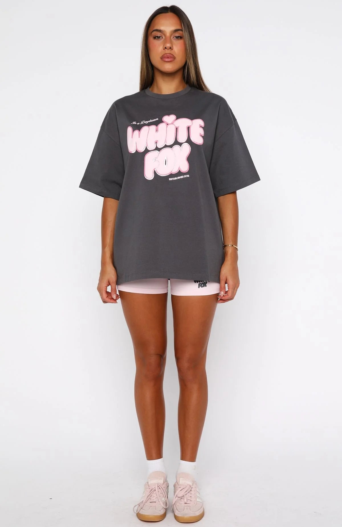 The Daydreamers Angelina Oversized Tee Volcanic is for the ones who glow even in their off duty hours! Featuring a ribbed crew neckline, relaxed drop shoulder design, breezy short sleeves an over sized silhouette. Finished off with a White Fox puff print text centre front with glitter outlining detail. Pair with the matching Daydreamers Angelina Bike Shorts Soft Pink for an outfit worthy of stares!