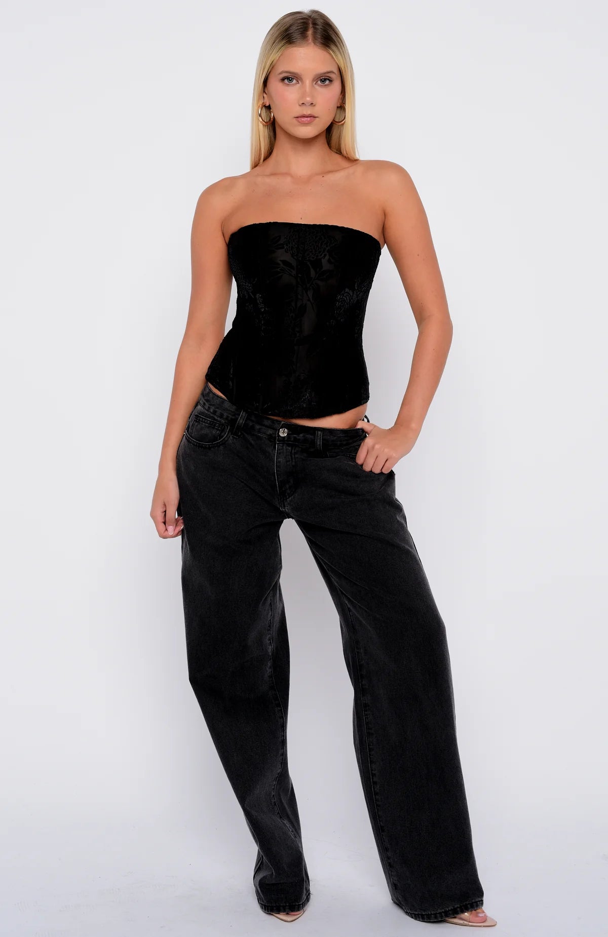 A moment for the Don't Be Indecisive Strapless Bustier in Black! It features a sleek strapless neckline complemented by structured bodice boning for a sculpted silhouette. Luxurious velvet floral detailing adds romantic texture, while full lining ensures both comfort and confidence. An invisible back zipper and discreet hook-and-eye closure deliver clean, seamless styling. Pair with your fav denim jeans, kitten heels and layered gold jewellery to turn all heads.