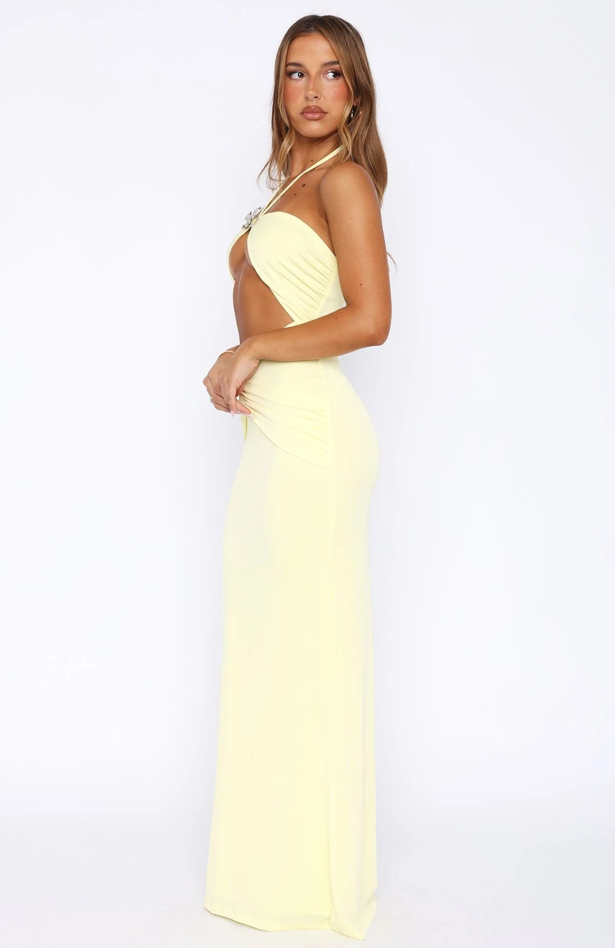 Your search for the perfect birthday dress is over! The Don't Take Too Long Maxi Dress Lemon will have you at the centre of everyones attention. Features a halter neck design with self tie straps, centre front cut out design with silver butterfly design, maxi length and stretch material.