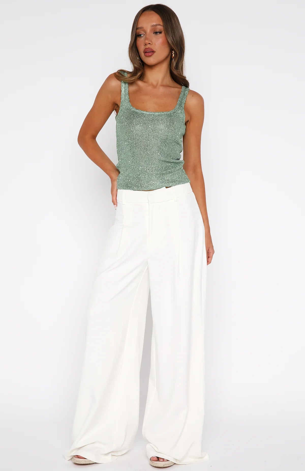 Vacay fit sorted! The Down For Me Sequin Knit Top in Spearmint boasts a flattering scoop neckline, sturdy shoulder straps, and stretchy knit fabric dusted with subtle shimmer. Style with mini shorts, kitten heels and layered gold jewellery for the ultimate summer nights fit.
