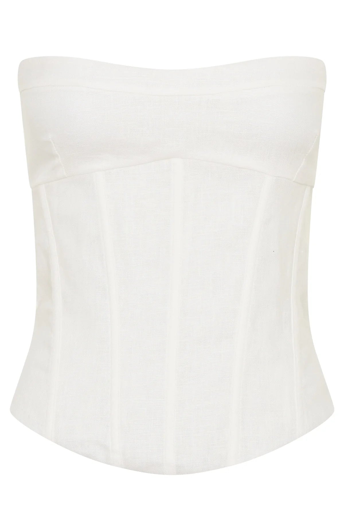 Simple joys, timeless style! The Downtown Pulse Strapless Bustier White features a strapless neckline with grip‑tape support, an under‑bust seam and boning down the bodice for structured elegance, a back zipper with hook‑and‑eye closure and fully lined for comfort. Style with the matching Unfinished Feelings Pants White, sandals and a chic bag for a merry look.