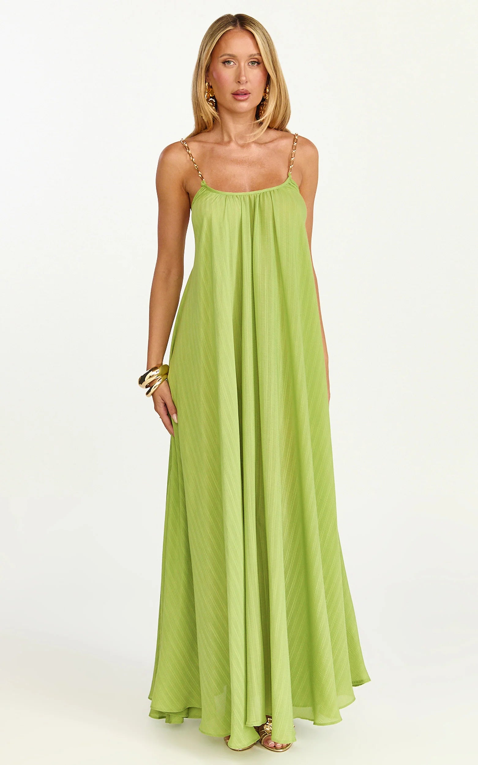 Eliana Maxi Dress - V Neck Chain Strap Tie Back Shift Dress In Green nails the balance of ease and elegance, flattering a range of body shapes and sizes. Go minimal with pared-back glam or dial it up with bold earrings and a clutch. However you wear it, you’ll feel comfortable, confident and party-ready.