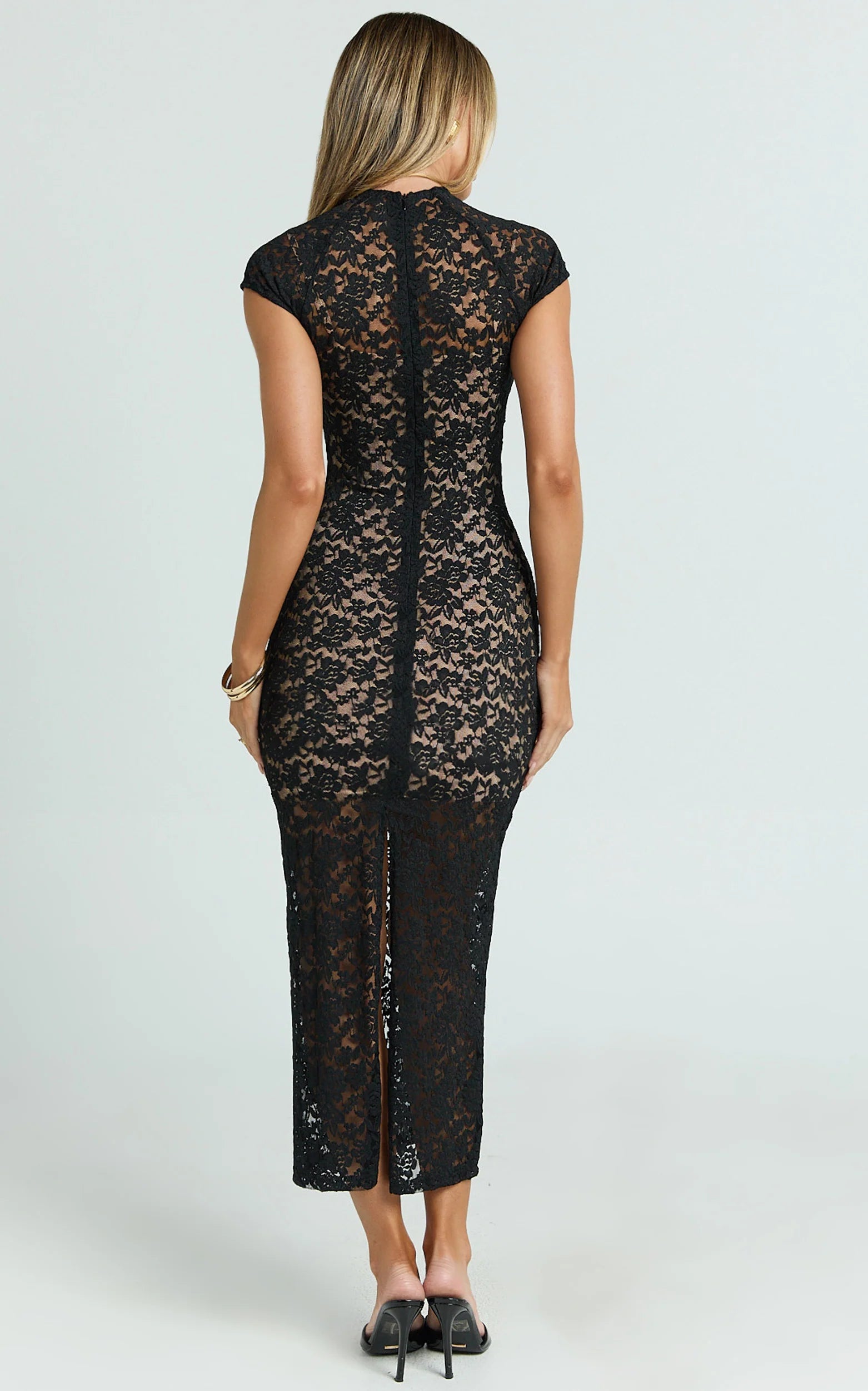 This stunning black bodycon dress is your ultimate shortcut to glamour, featuring delicate lace cap sleeves and a flattering fit that beautifully accentuates your curves. Pair it with oversized pieces, like a bold blazer, for eye-catching contrast, or add touches of red through heels and lipstick for a sultry, confident look.
