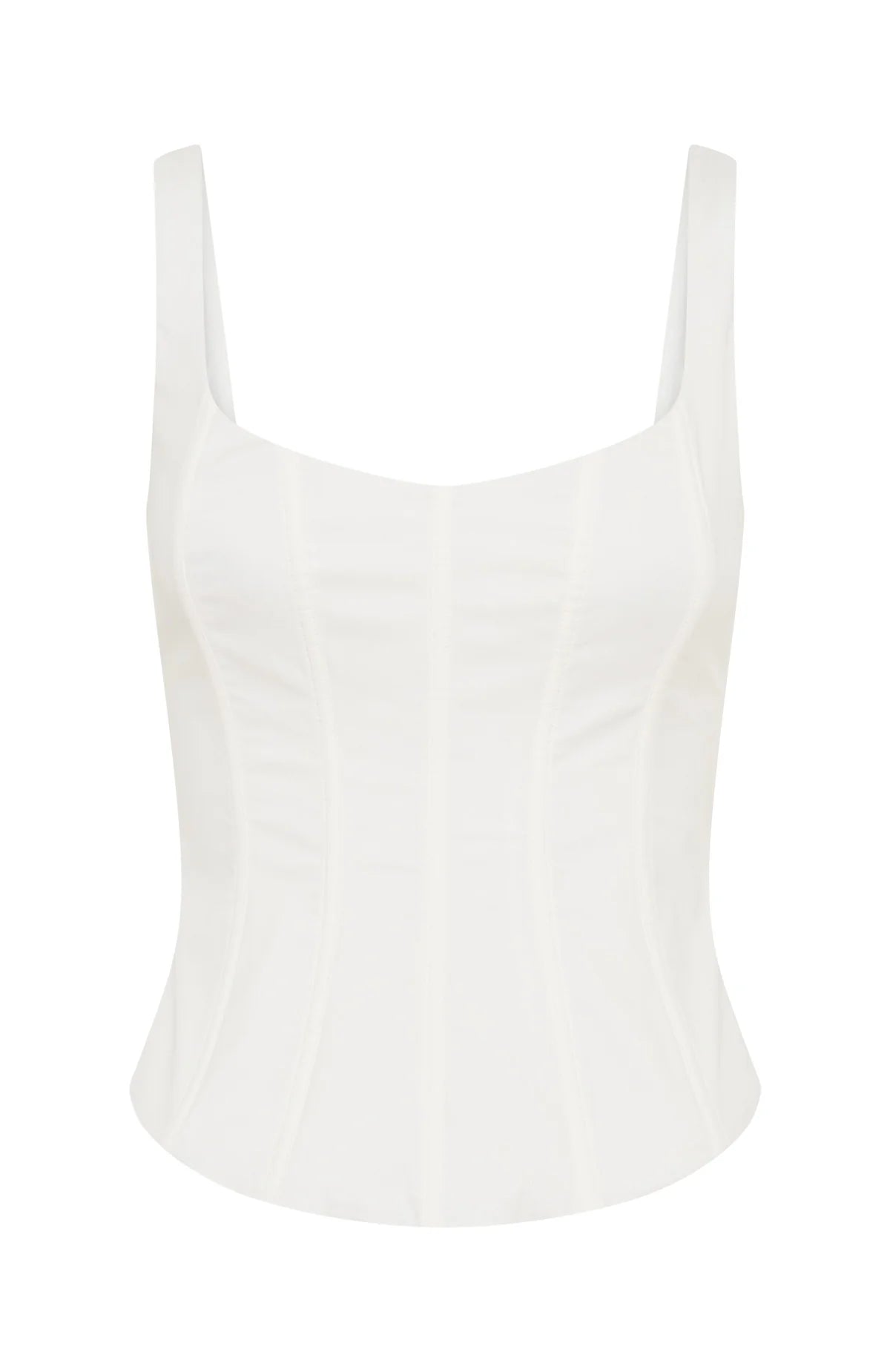 Santa's favourite! The Empire Energy Bustier White features thick shoulder straps, a flattering scoop neckline, structured internal boning down the bodice, a secure back zipper with hook-and-eye closure, and is fully lined for a flawless finish. Style with the matching Empire Energy Midi Skirt White, heels and chic layered gold jewellery.