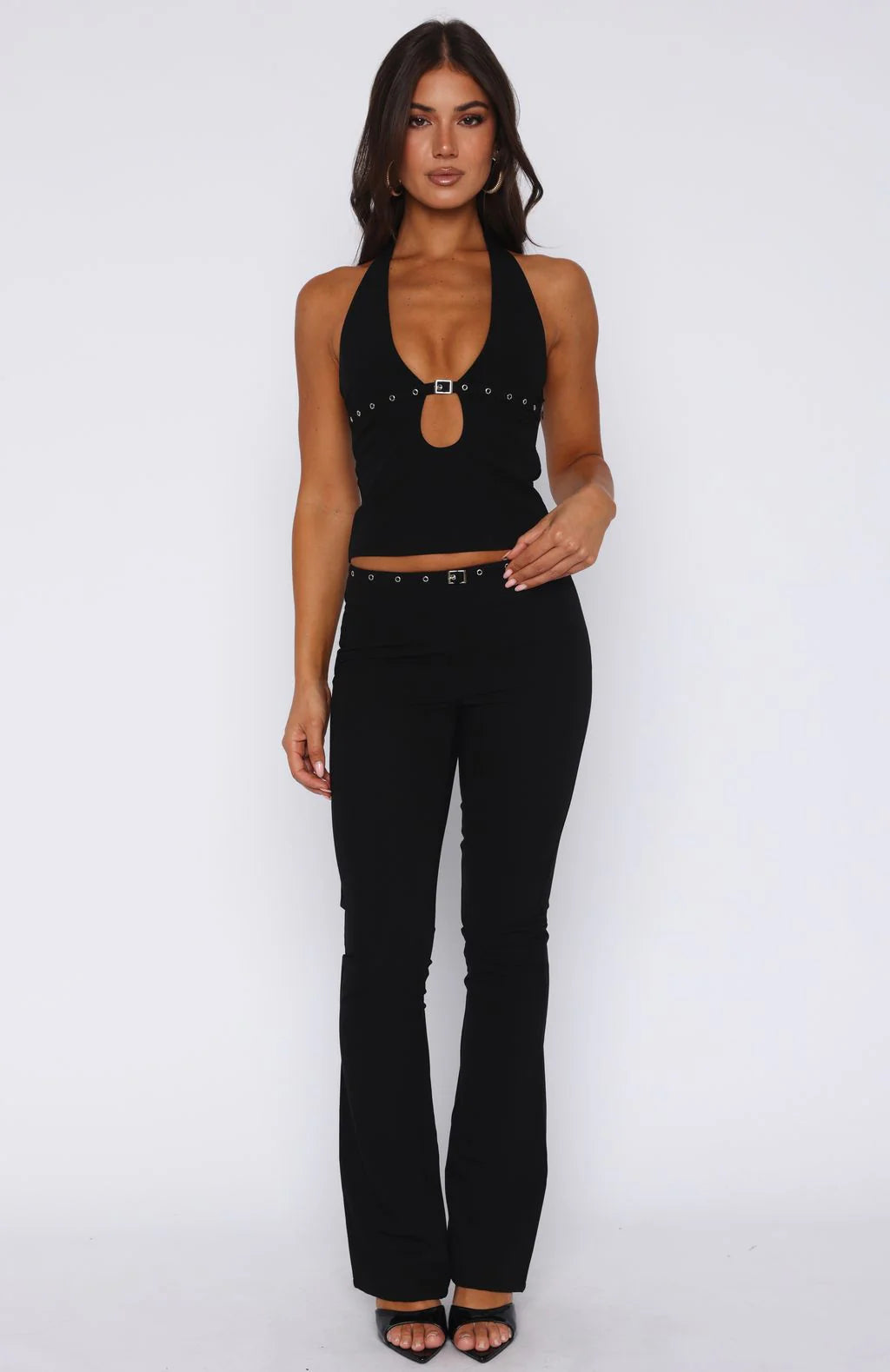 Turn heads in the The Firestorm Halter Top in Black. Features a halter style neckline with closure, plunge neckline with front cut out design, front buckle design with silver hardware, cropped fit, hidden side zipper with hook & eye, mesh lined and hugging fit. Complete the look with the matching Firestorm Pants in Black for a look we love!