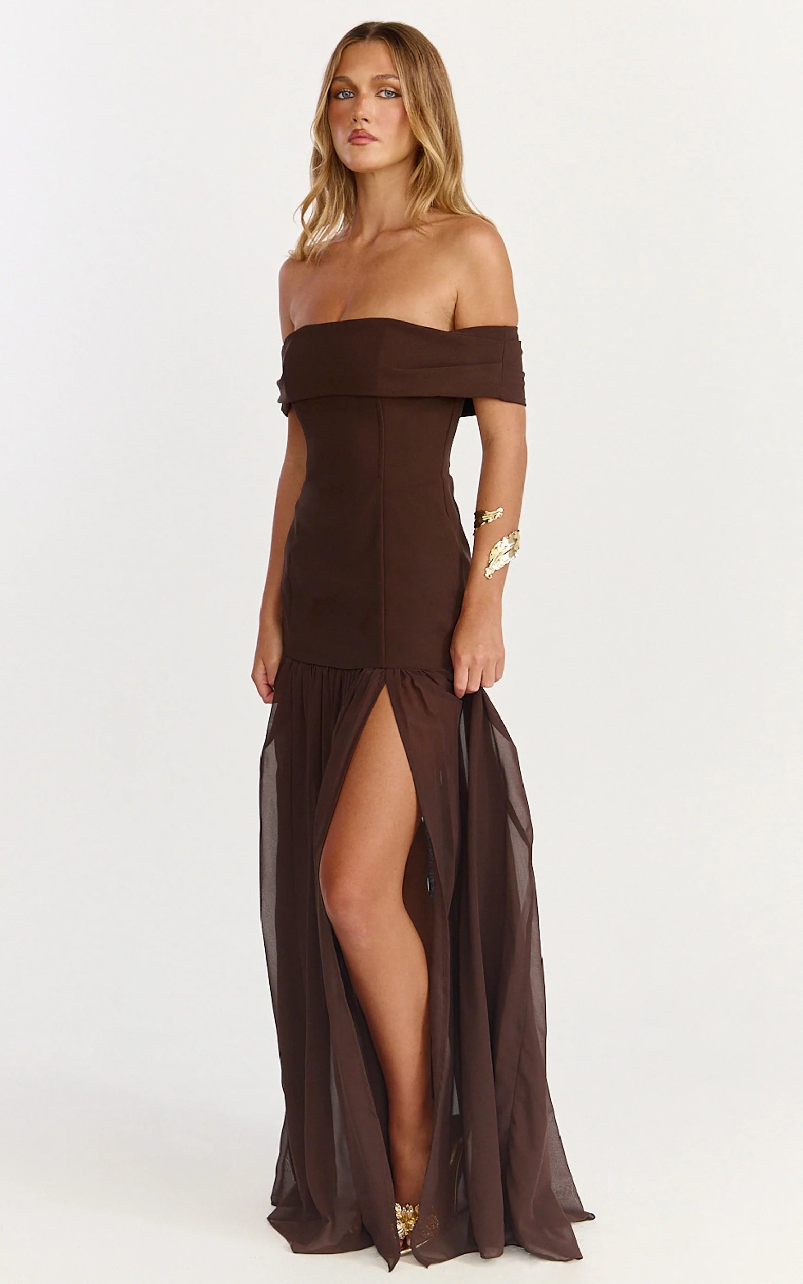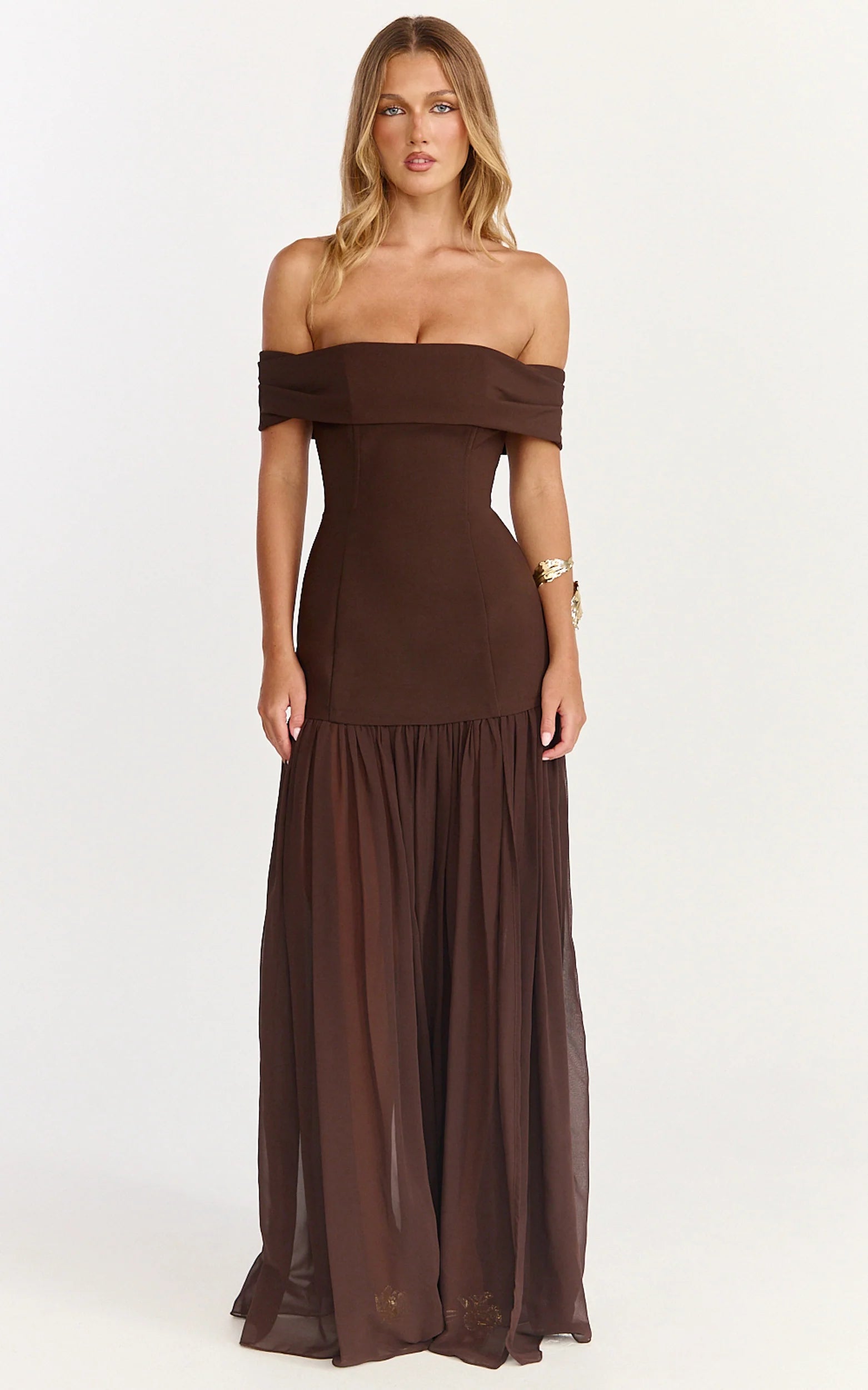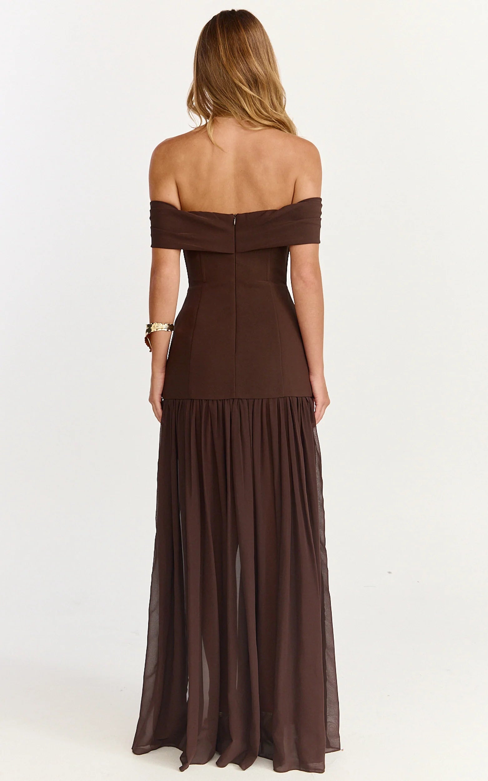 The Florence Maxi Dress - Off Shoulder Sheer Skirt Dress In Chocolate is your go-to for weddings, long lunches and nights that run late. The rich brown tone plays beautifully with warm skin tones and cool complexions alike, making it one of those dresses you’ll reach for on repeat.