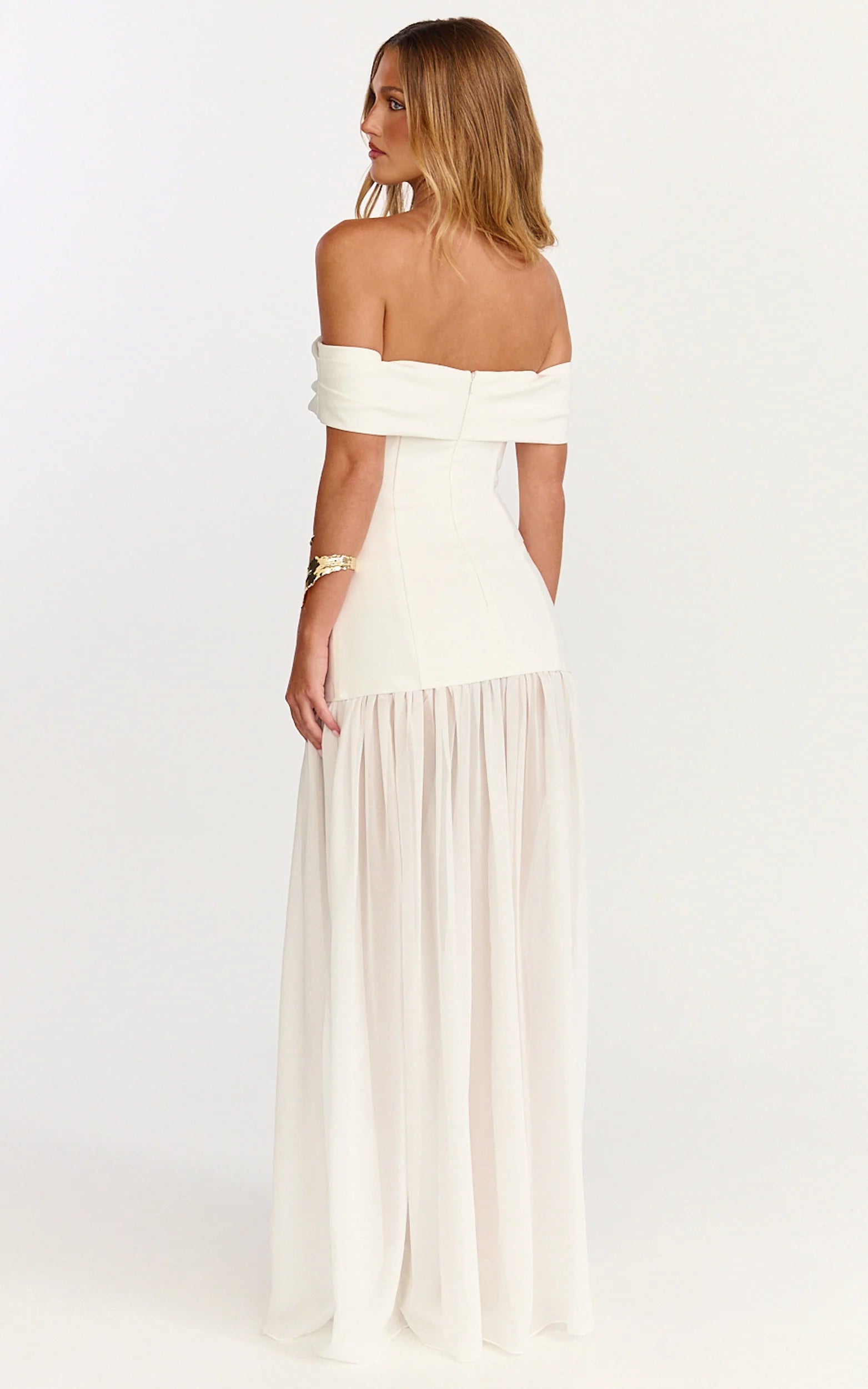 This off-shoulder white maxi brings a soft, ethereal vibe with a sheer skirt that swishes as you move, think effortless elegance without the fuss. The fitted bodice flatters your shape, while the flowing hem adds drama in the best way. It’s the piece you reach for when you want confidence to come easy.