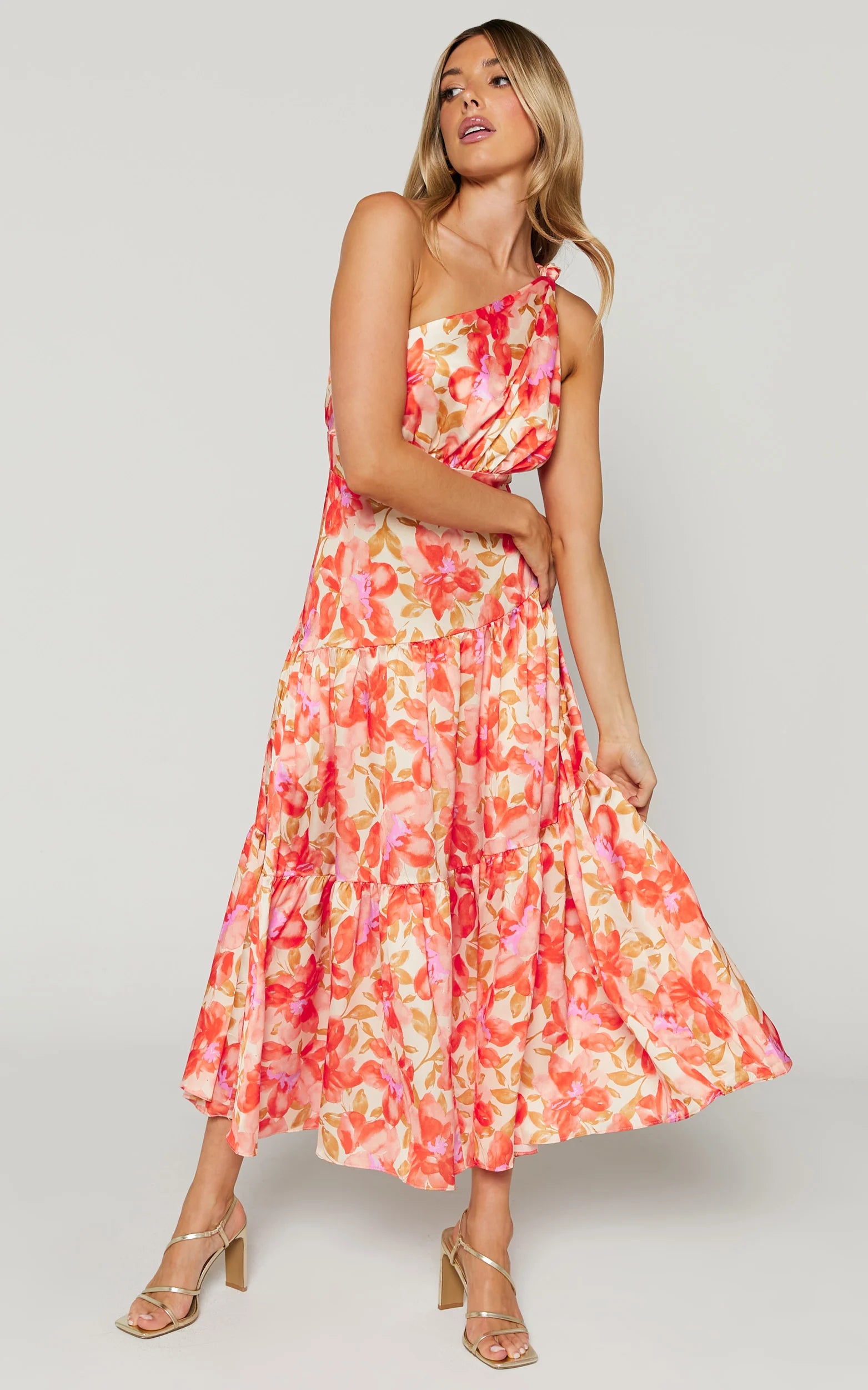The Georgine Midi Dress in Autumn Floral features a tiered skirt that creates a flowy, elongated silhouette that moves with you, while the rich orange floral print brings standout charm from brunch to dance floor. Softly ruched through the bodice for a flattering fit, it’s that flirty-yet-polished moment you’ll keep reaching for. It turns up the romance with sculptural tiers and a one-shoulder neckline that frames your glow. Style it with minimalist sandals for effortless elegance, then add metallic sunglasses for a touch of shine. A go-to midi when you want compliments on repeat.