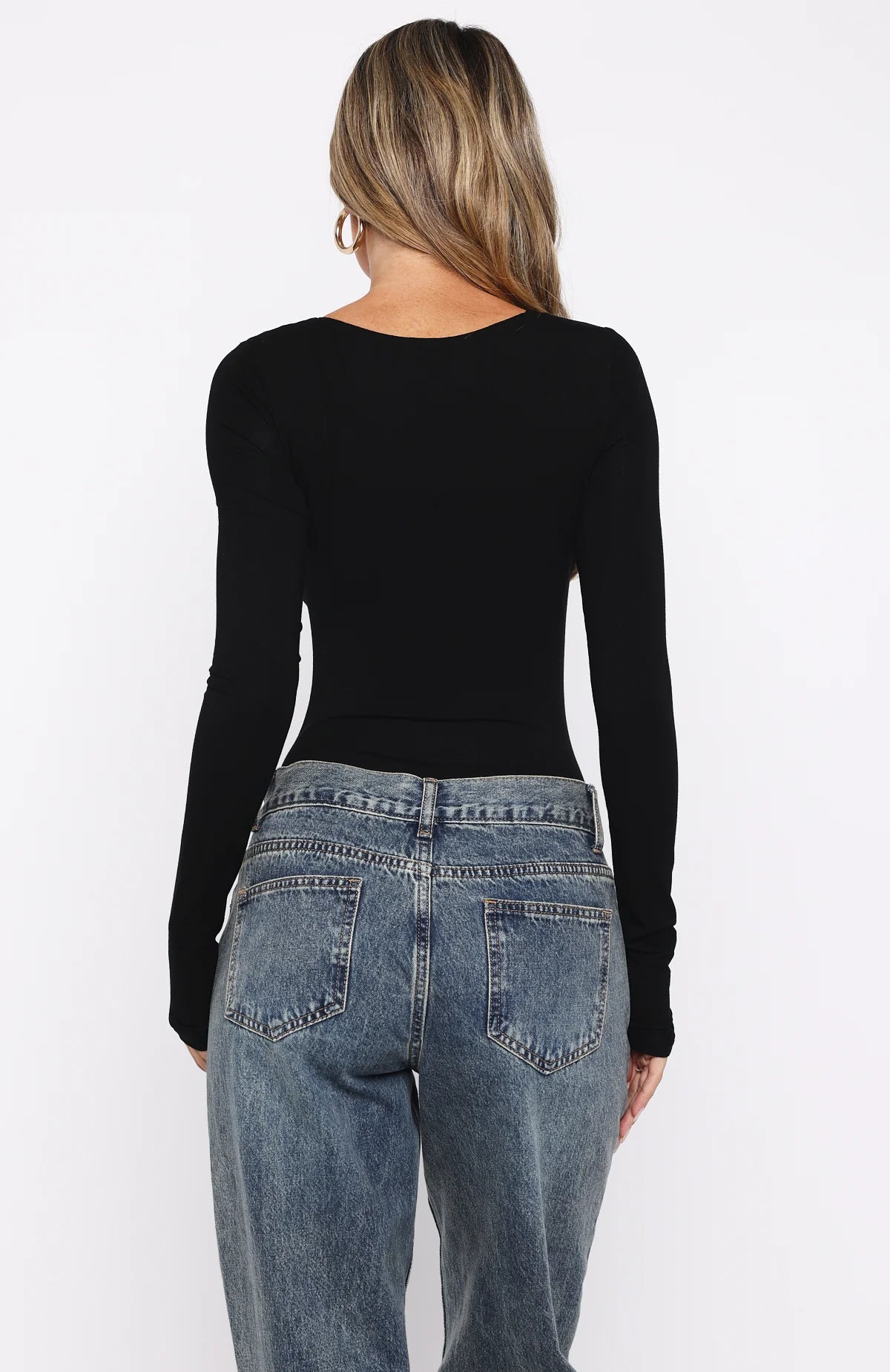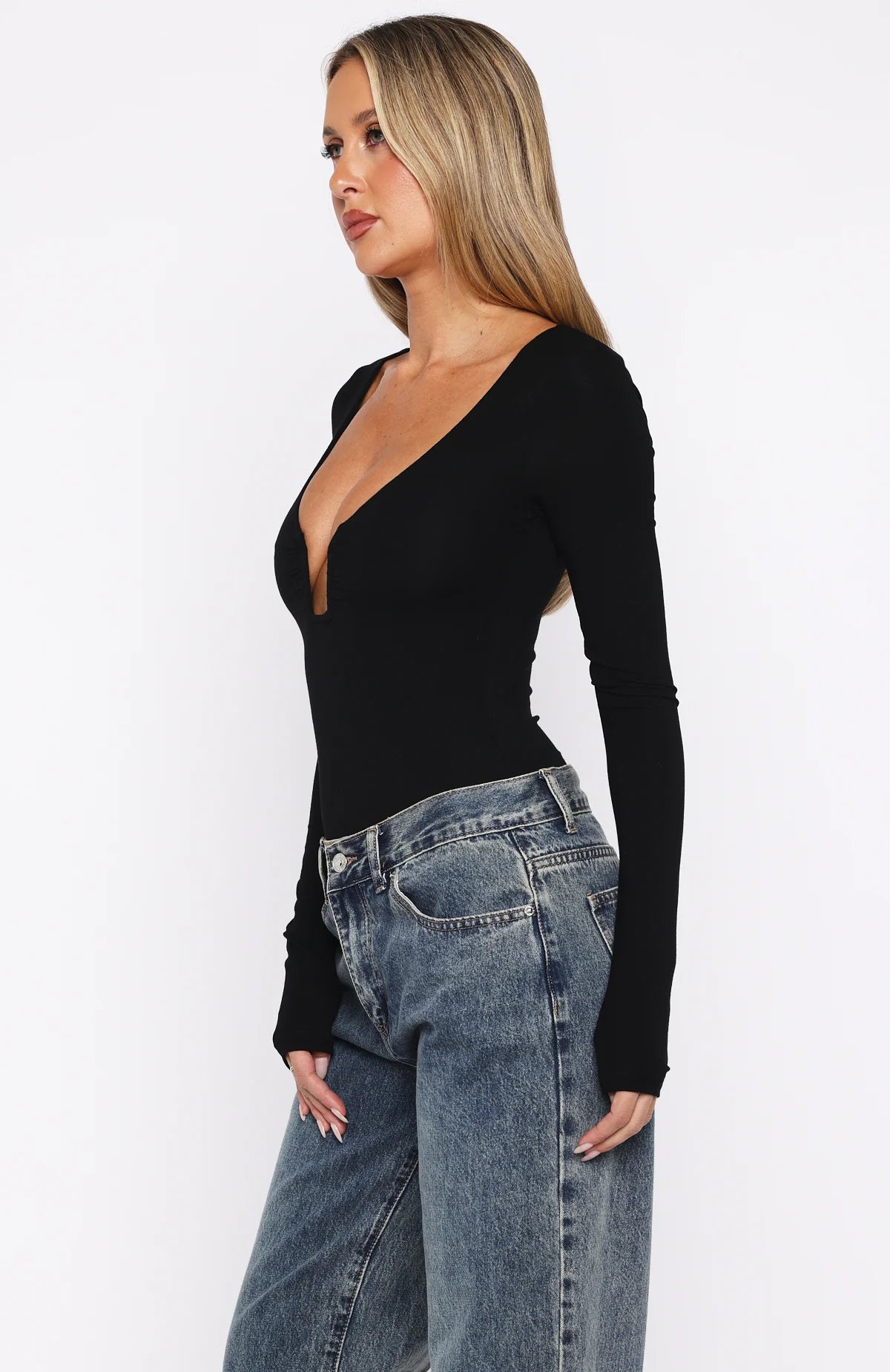 Make everyday chic! The Girls Night Out Long Sleeve Bodysuit Black features a dramatic plunge neckline with subtle boning and sculpted bust detailing, long sleeves, and a form-fitting silhouette made from high-stretch fabric for a sleek, second-skin finish. Style it with your go-to denim jeans, kitten heels, and layered gold jewellery for an effortless yet striking look.