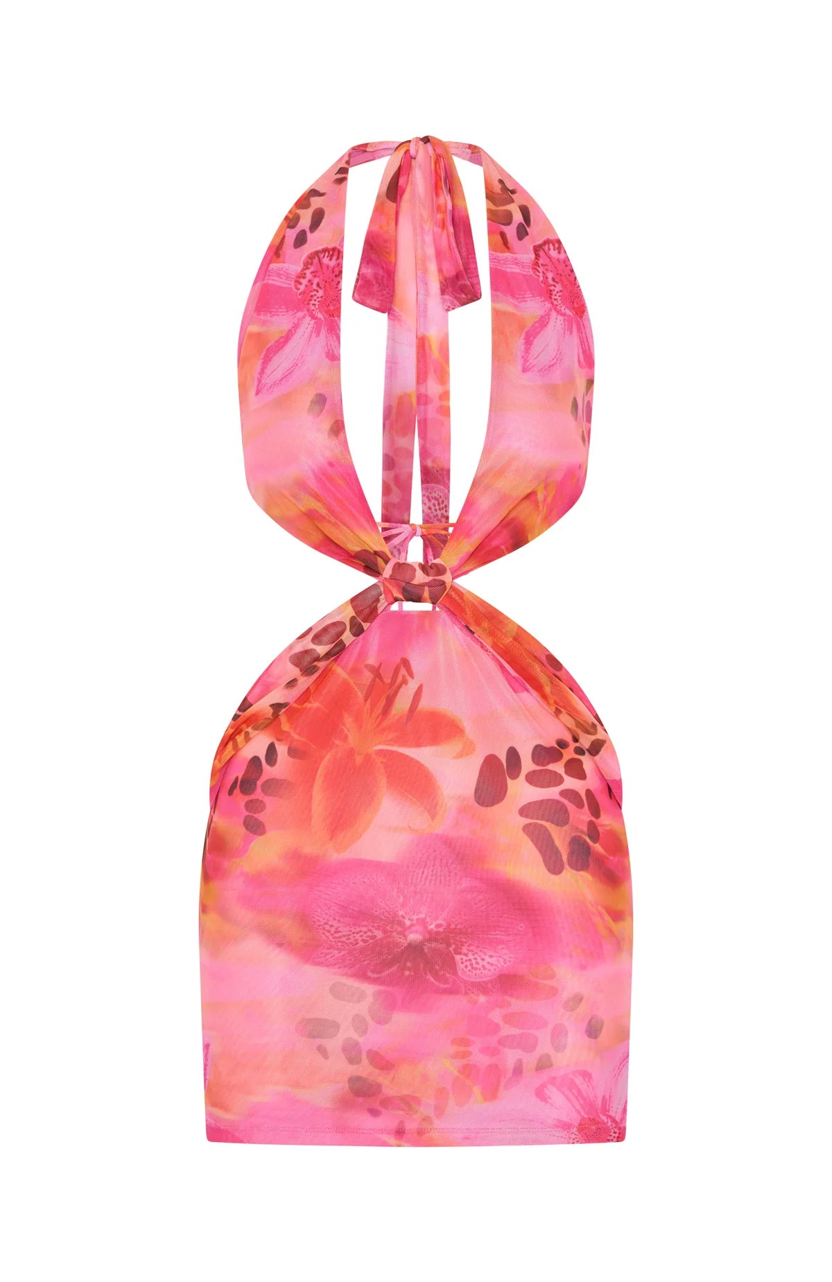 Stand out in the Good Decisions Mini Dress Paradise Dreams! Features a halter style neckline, mesh lined, slightly sheer, front cut out detailing, mini length, ultra low-cut neckline, back self tie detailing and gorgeous printed fabric. Pair with knee high boots and gold accessories!