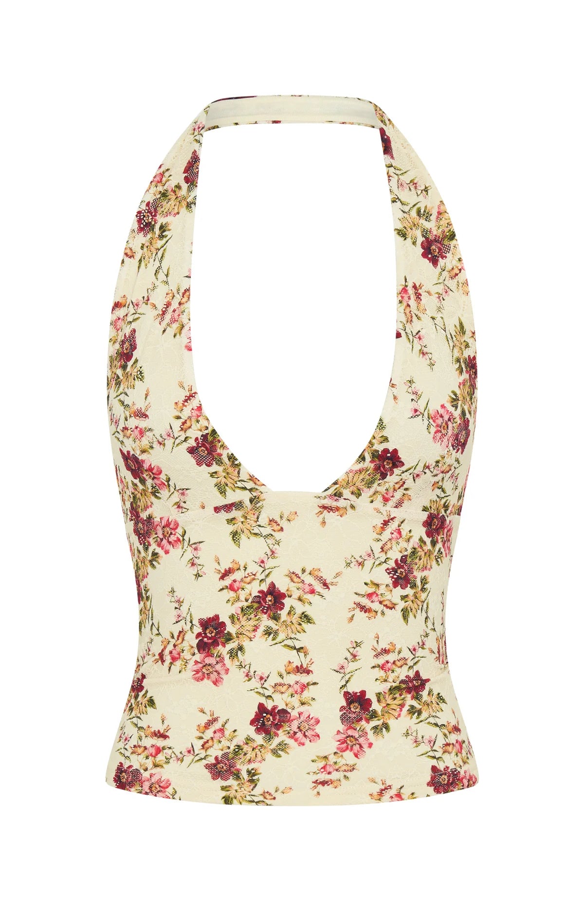 Embrace sunny days with the If You Please Halter Top in Antique Garden. This playful piece features a halter neck design, lined printed lace fabric, cropped length, backless design, front low plunge neckline, and stretch material for an easy slip on design. Perfect for warm weather, it pairs effortlessly with the matching If You Please Mini Skirt for a fun, flirty look.