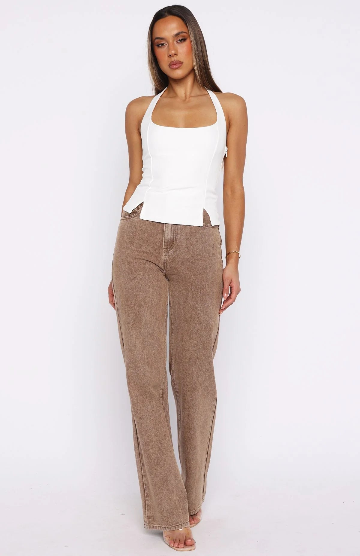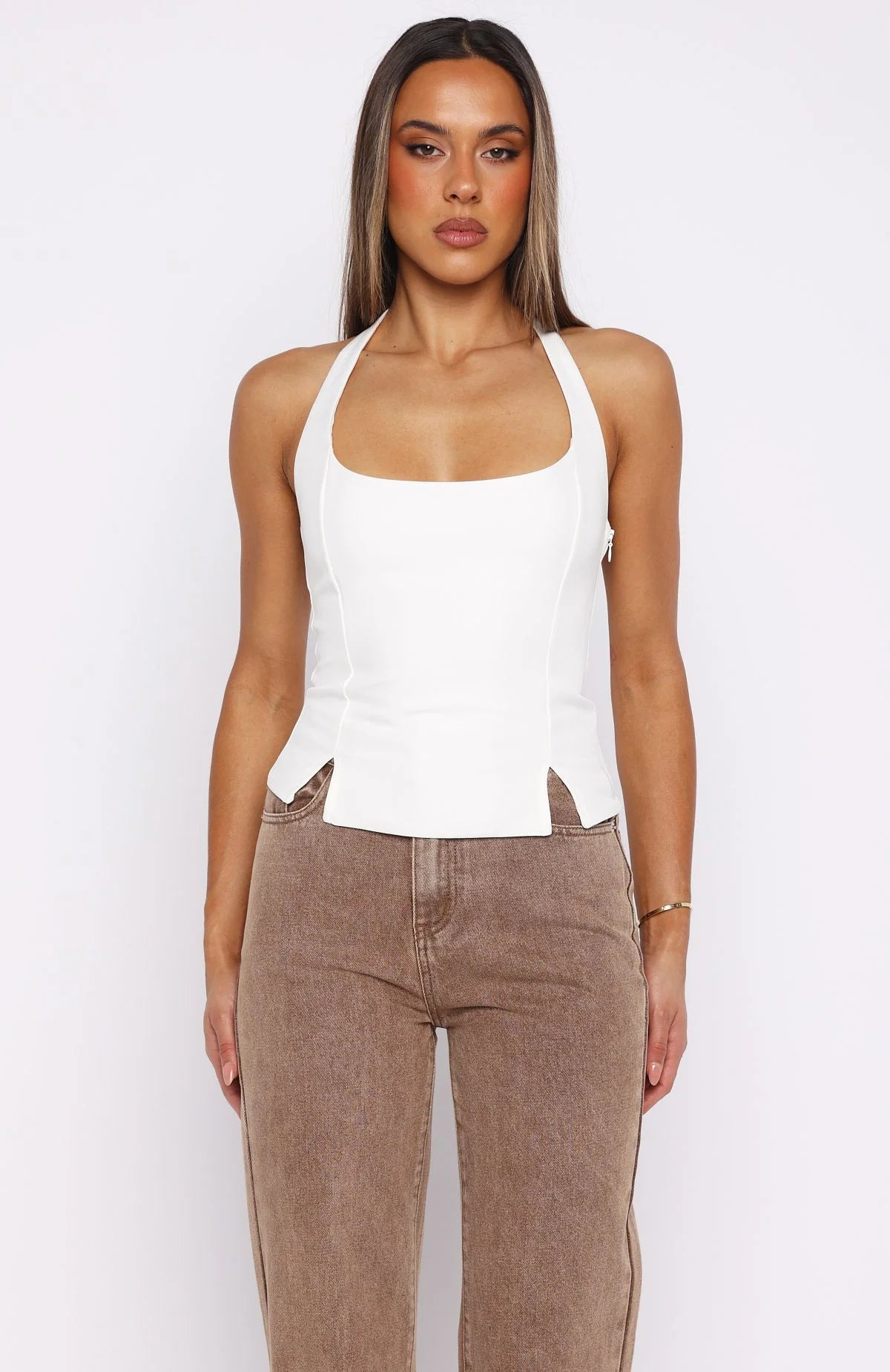 Sculpting silhouettes! The I'm Next Halter Top in Off White features halter straps, a square neckline, and a fitted bodice that flatters your form. A button closure at the nape and side zipper ensure a seamless finish, while the hem slit adds a touch of edge. Pair with jeans, boots, and layered gold jewellery for a concert‑ready ensemble.