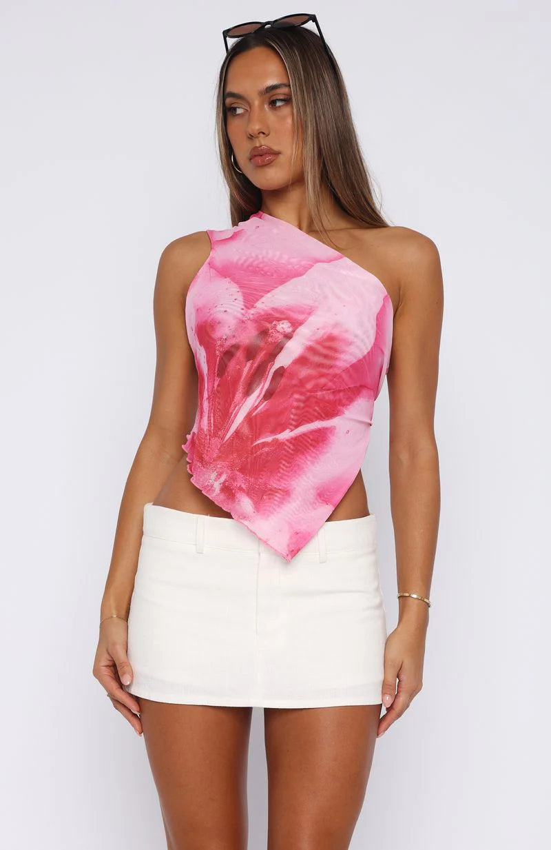 Embrace the heat with The In Your Dreams Top Blush Bloom features a one shoulder design, slightly sheer, unlined material and wrap design. Style with booty shorts, cowboy boots and layered jewellery!