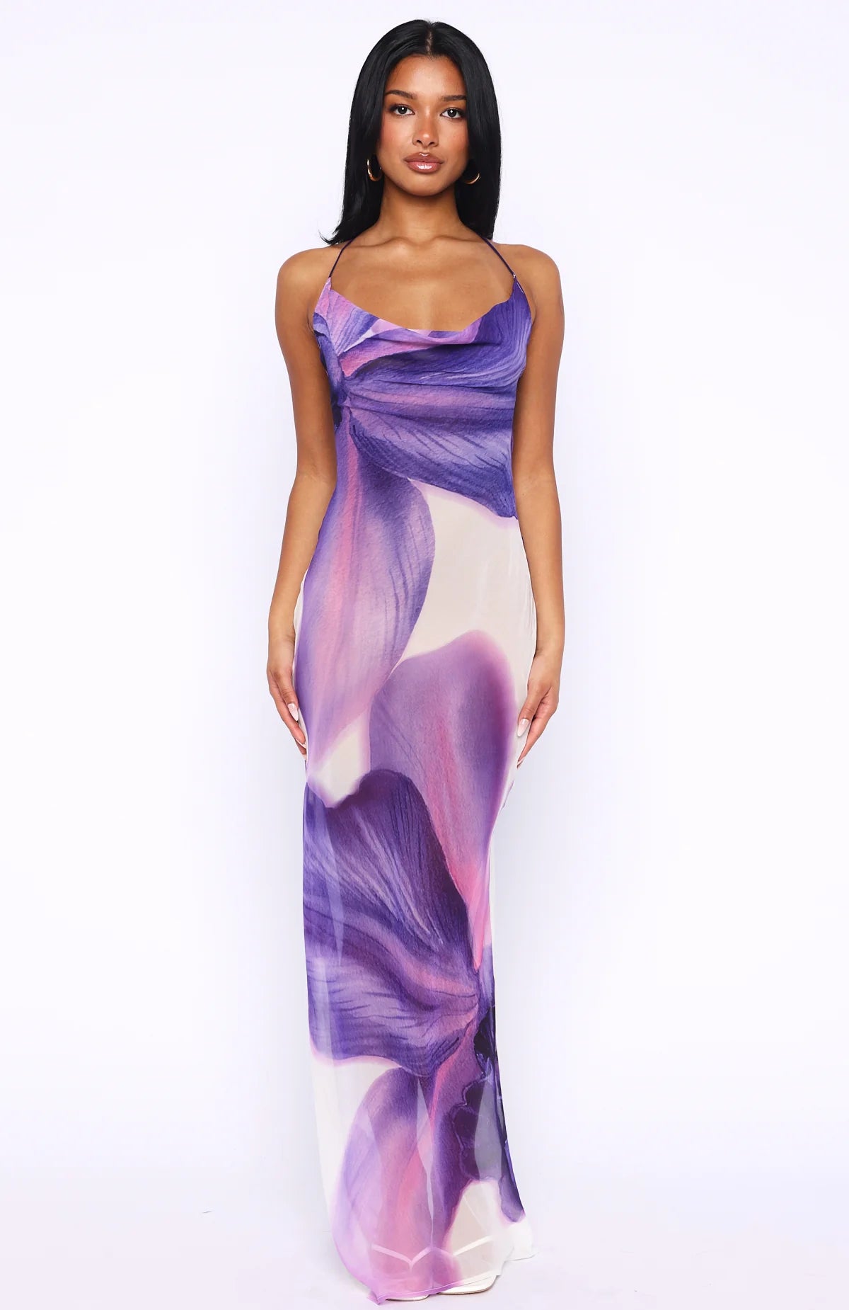 Linger under golden skies in the Just For Me Maxi Dress in Hyper Floral! This full-length, backless design features adjustable spaghetti straps that cross at the back, offering a customizable fit. The cowl neckline adds a touch of sophistication, while the sheer fabric makes it an ideal layering piece over your favorite bikini. Style with layered gold jewellery and simple sandals.