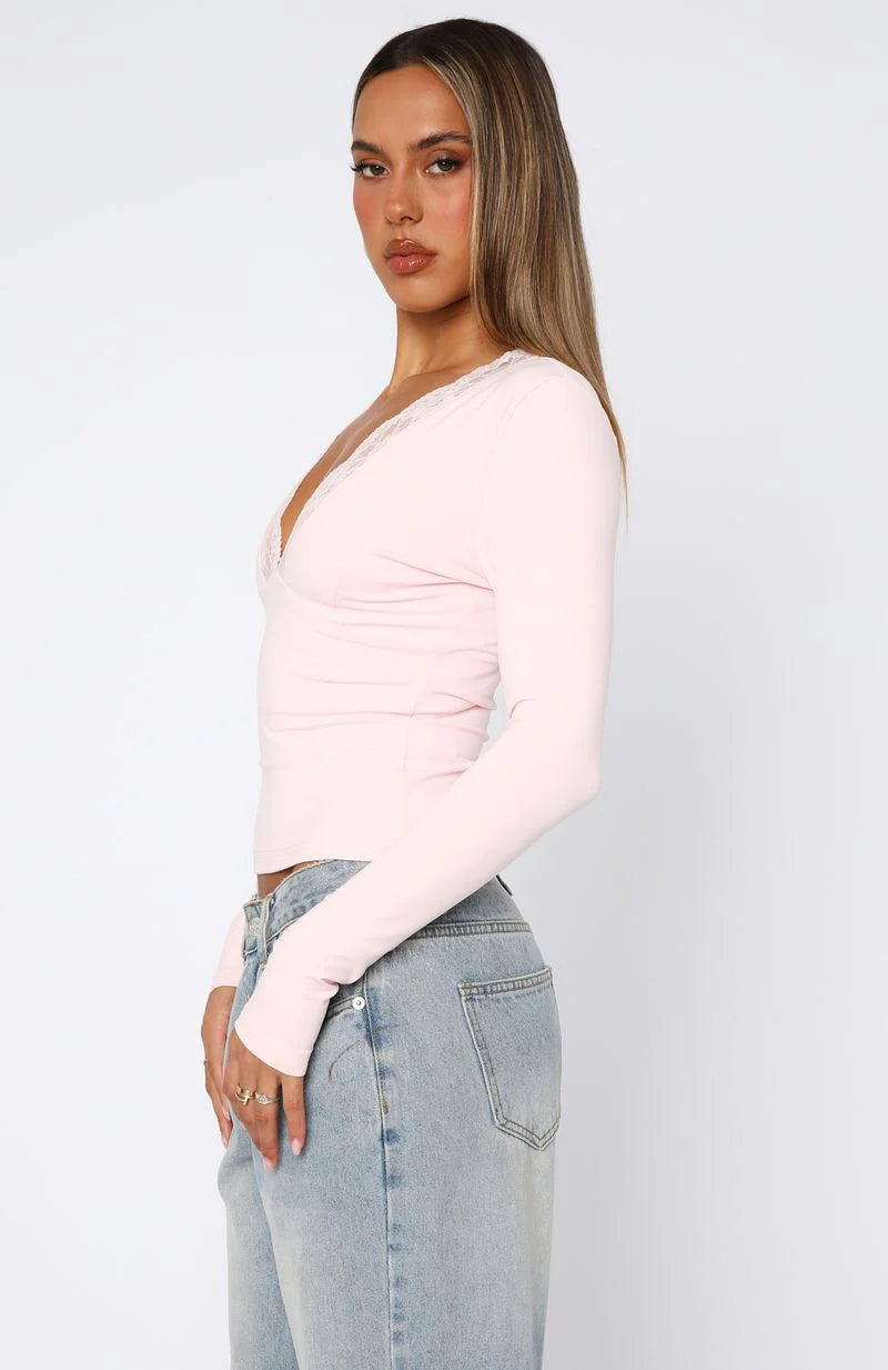 Last minute weekend agenda set—time to rock a killer 'jeans and a cute top' combo! The Knew That All Along Long Sleeve Top Baby Pink features a V cut neckline with lace trim detailing, long sleeves, unlined and stretch material for an easy slip on design. Pair with your favourite WF jeans and gold accessories.