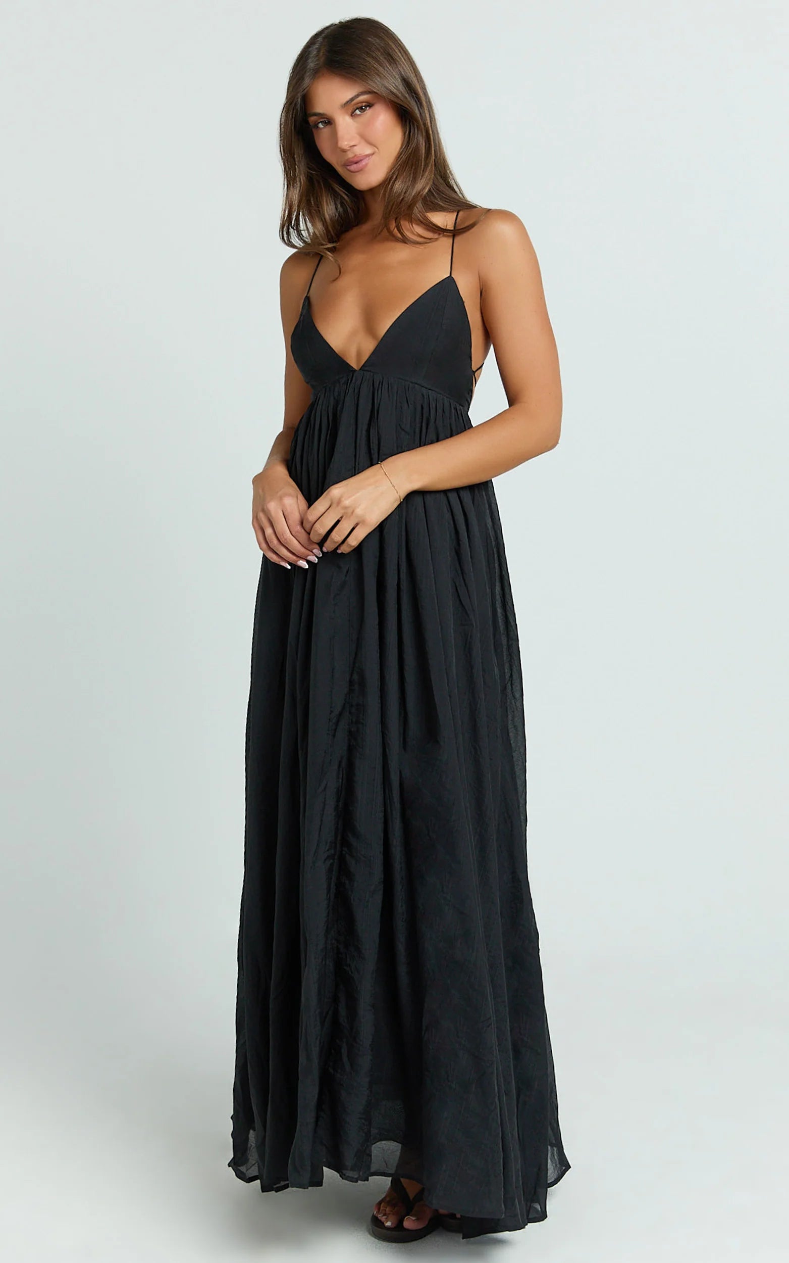 A curve-defining waist flows into a swishy maxi hem for that twirl-worthy moment, while the deep neckline is equal parts flirty and polished. Think Monochrome mood with a Minimalist silhouette, clean lines, zero fuss, maximum impact. Perfect for cocktail hour, weddings, and any RSVP where “wow” is the dress code.