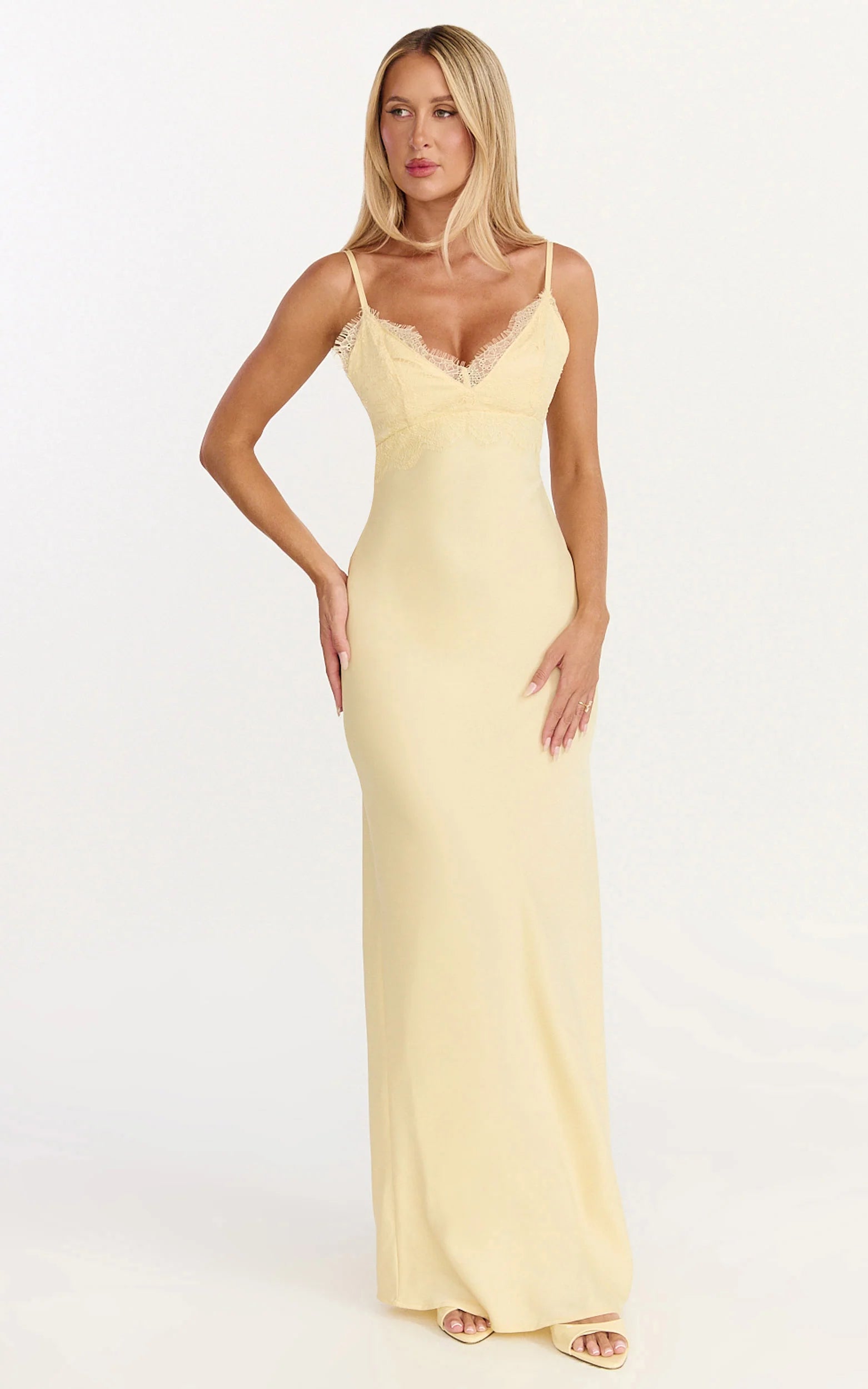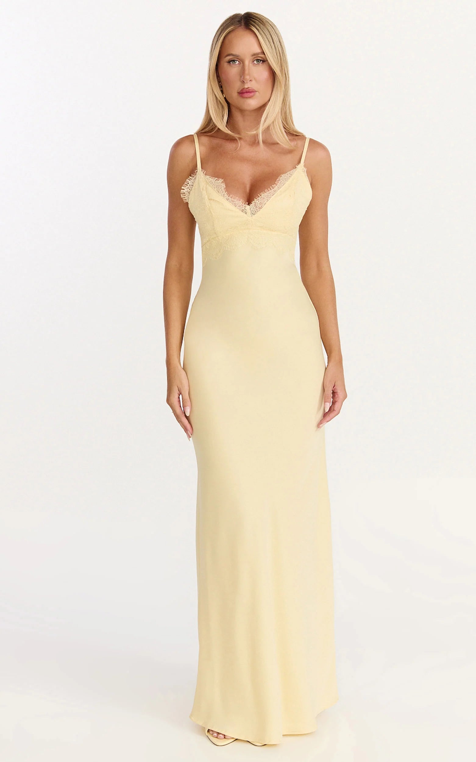 A lace bust and tie-back detail frame your shape, while the satin-like finish skims with a soft shine for an elevated, occasion-ready look. The silhouette flatters from every angle, fitted up top, flowing through the skirt, so you can dance, dine and feel incredible.