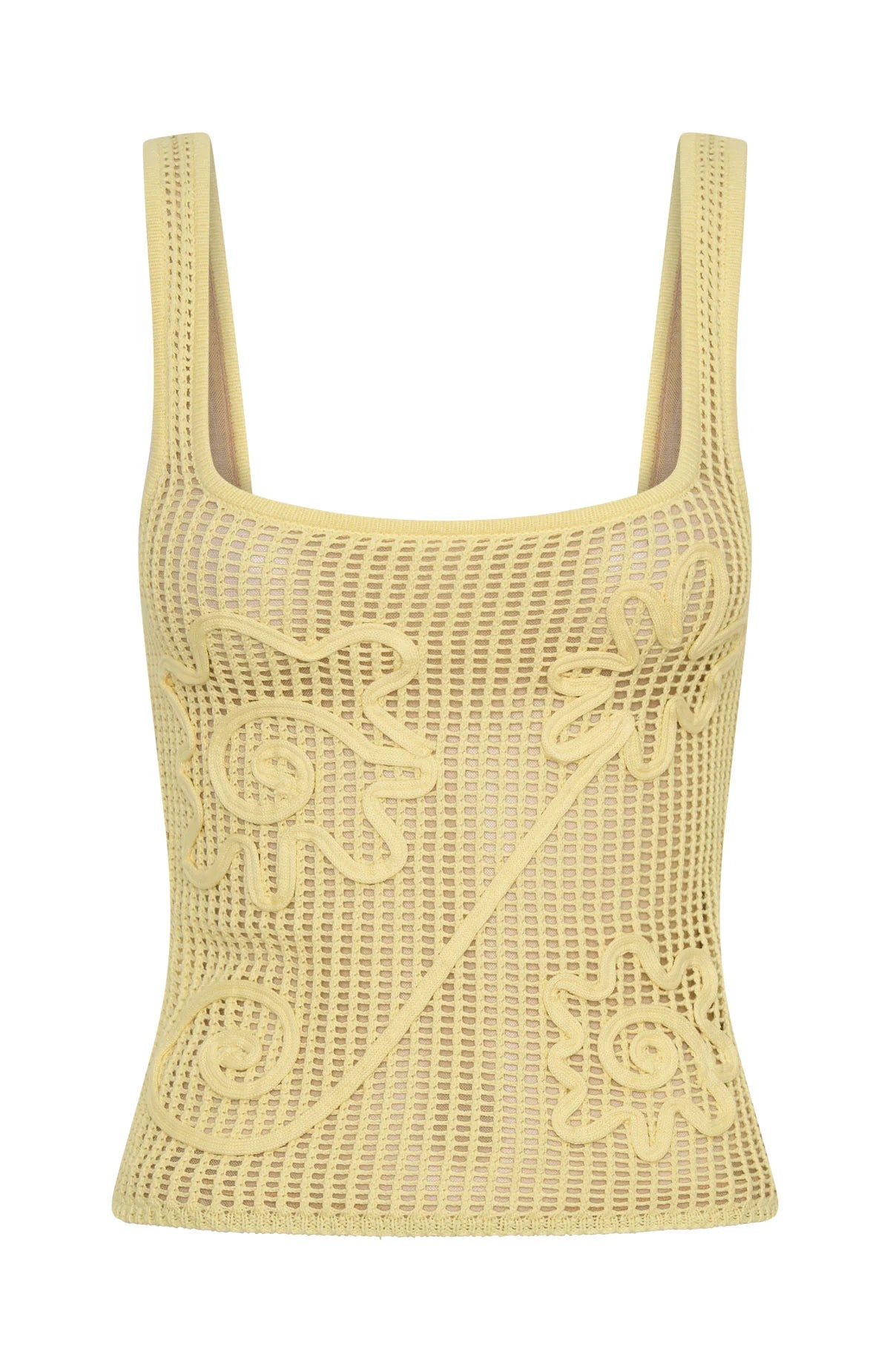 Introducing the set of the summer, meet the Living Loud Knit Top in Lemon! Features thick shoulder straps, a scoop neckline, and intricate floral knit detailing. Crafted from soft knit fabric, it features a mesh lining for added comfort. Style with the matching Living Loud Knit Mini Skirt and simple heels to let the set do all the talking.