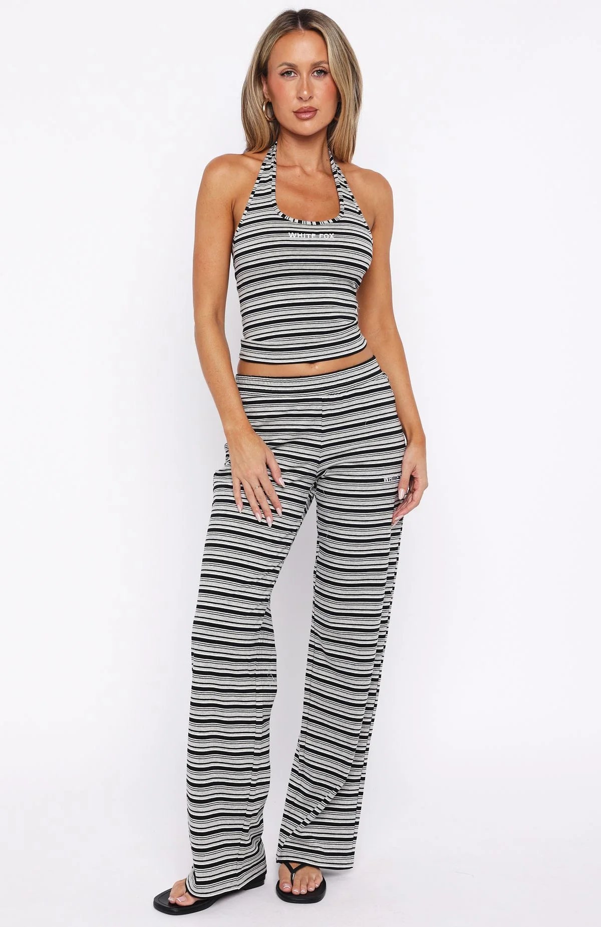 The cutest casual set has arrived! The Looking Back Halter Top Grey Stripe features a halter neck design with a chic scoop neckline and cropped silhouette, stretch material for an easy slip on design, finished with a centre front logo detailing. Style it with the matching grey stripe wide leg pants for a comfy and cool fit.
