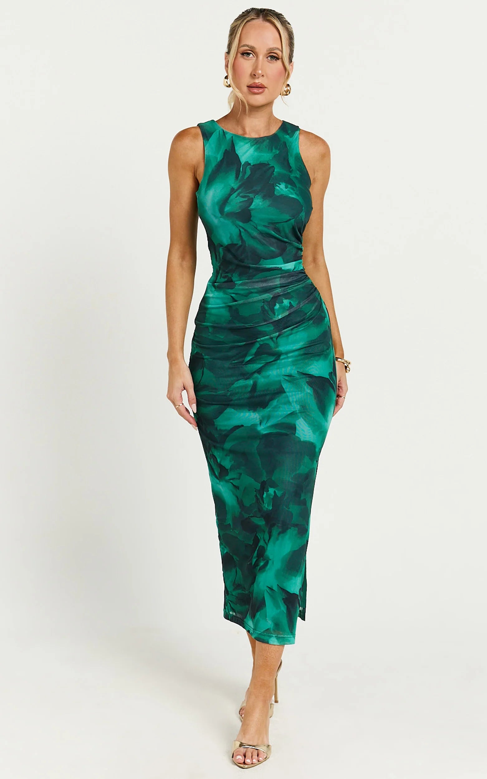 The Loralie Midi Dress in Green Floral Print brings a high-neck mesh bodice and a curve-skimming silhouette that turns heads with zero effort. The bold floral finish brings fresh colour play, while the smooth bodycon fit contours through the waist and hips for a confident, night-out-ready feel. Style it with chunky gold earrings and simple black slingbacks for a sleek evening moment, or throw on a cropped leather jacket and ankle boots for an edgier take. Add a tiny top-handle bag, and you’re set, clean, cool, and undeniably chic.