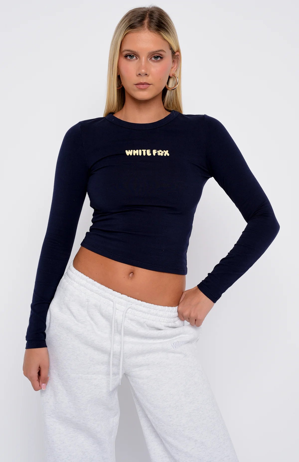 Addicted to Baby Tees? Meet your new fave: the Love Addiction Long Sleeve Baby Tee Navy. With its high neckline, stretch fabric, and puff‑print White Fox text at the centre front, this unlined, easy‑slip‑on design is made for effortless style. Pair it with sweatpants and gold accessories for a chic, cozy look that's simply irresistible.