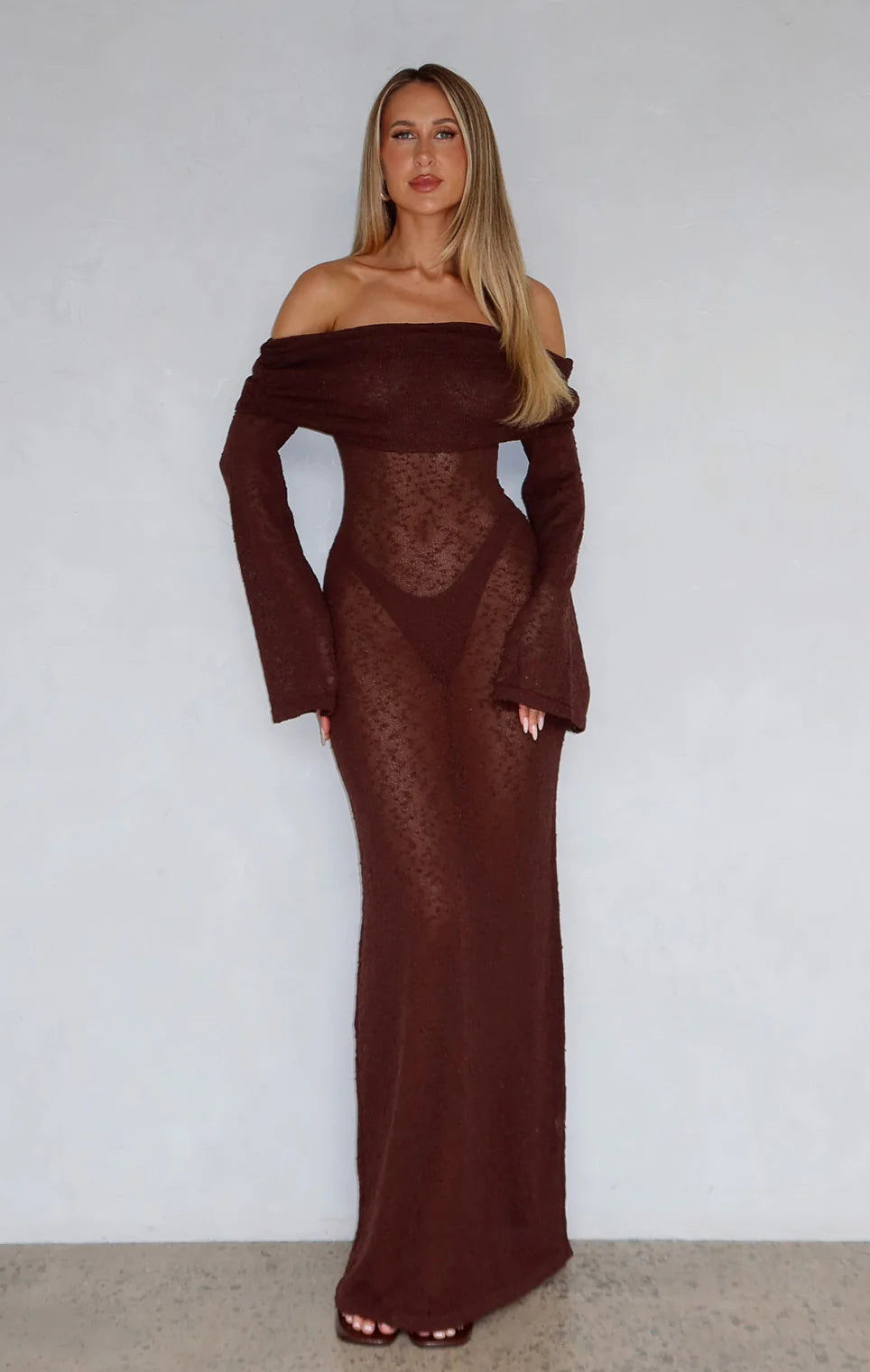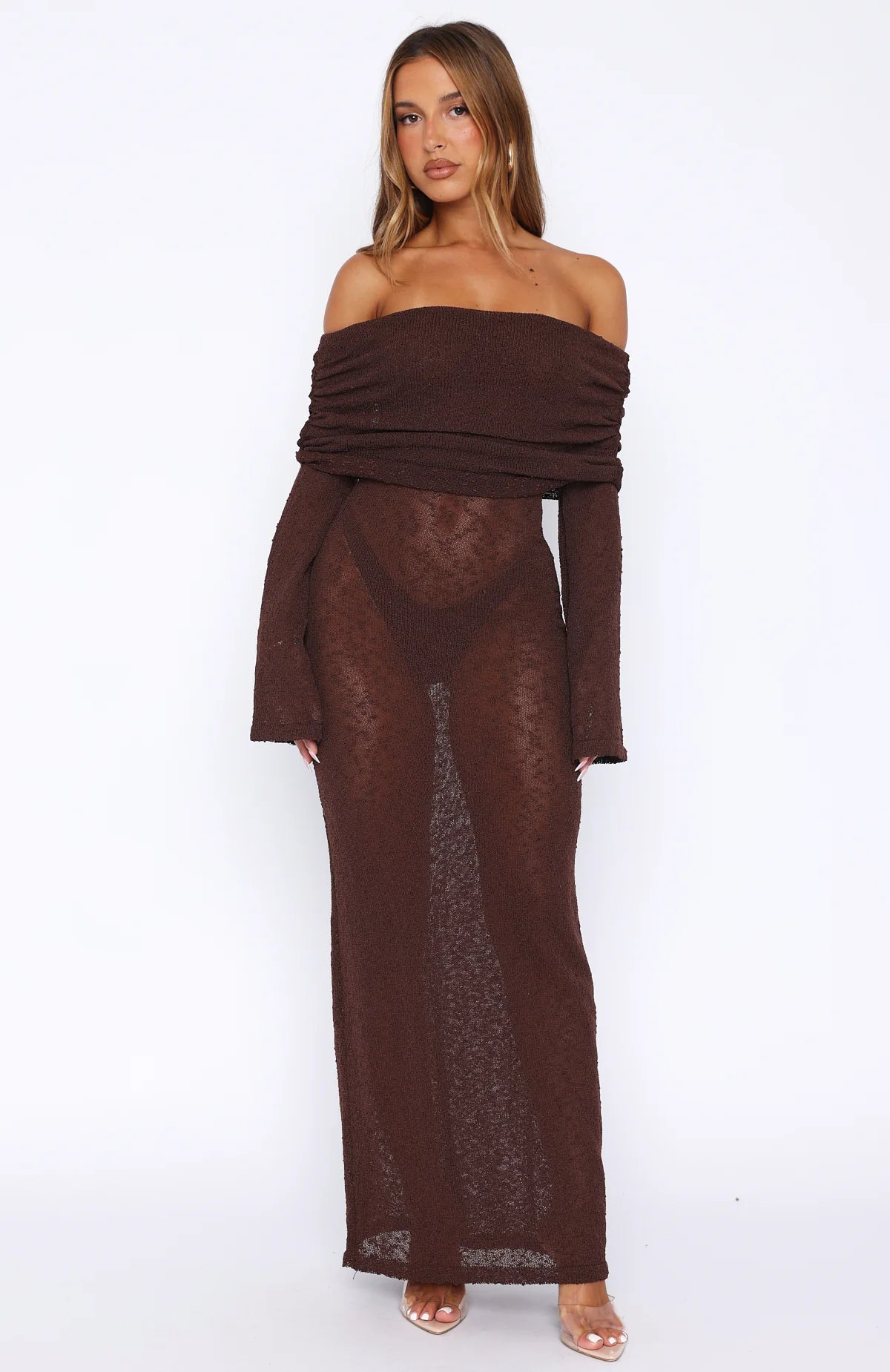 Need a dress to impress? We've got you covered. The Made It Out Long Sleeve Boucle Maxi Dress Chocolate features an off the shoulder design with a fold over detailing and bust grip tape, unlined bodice, maxi length, slightly sheer and stretch material for an easy slip on design.