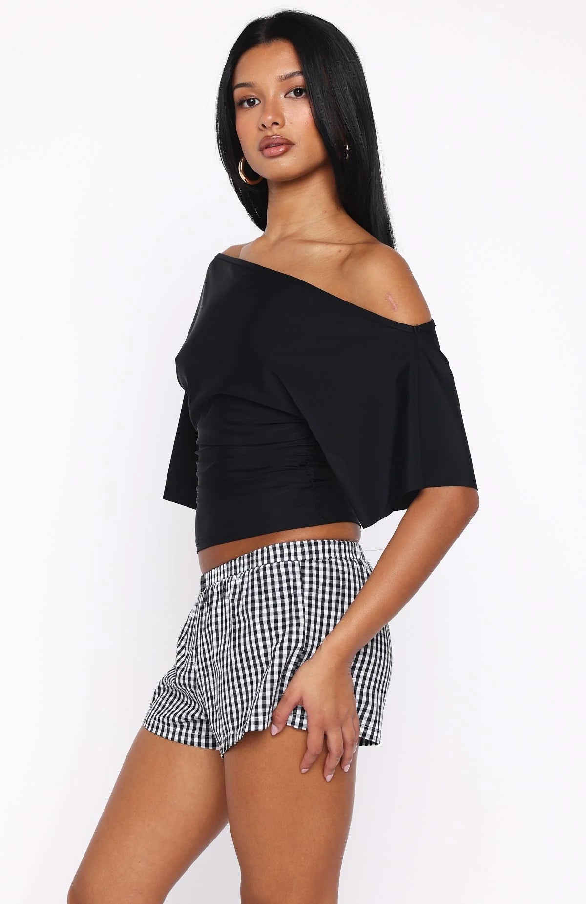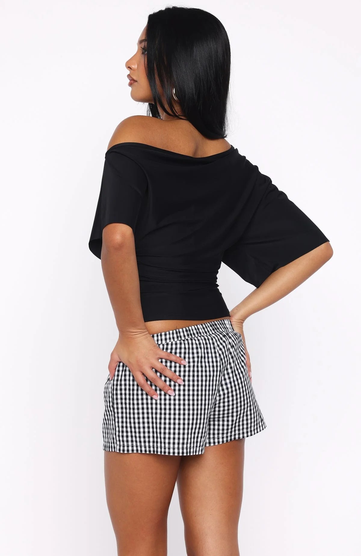 Feel effortlessly chic in the Marrakech Moments Top in Black! This off-the-shoulder design features relaxed short sleeves and ruched detailing at the side, creating a flattering cinched waist. Unlined for a lightweight feel, it's perfect for warm evenings. Pair it with mini shorts for a sultry, summery look that's sure to turn heads.